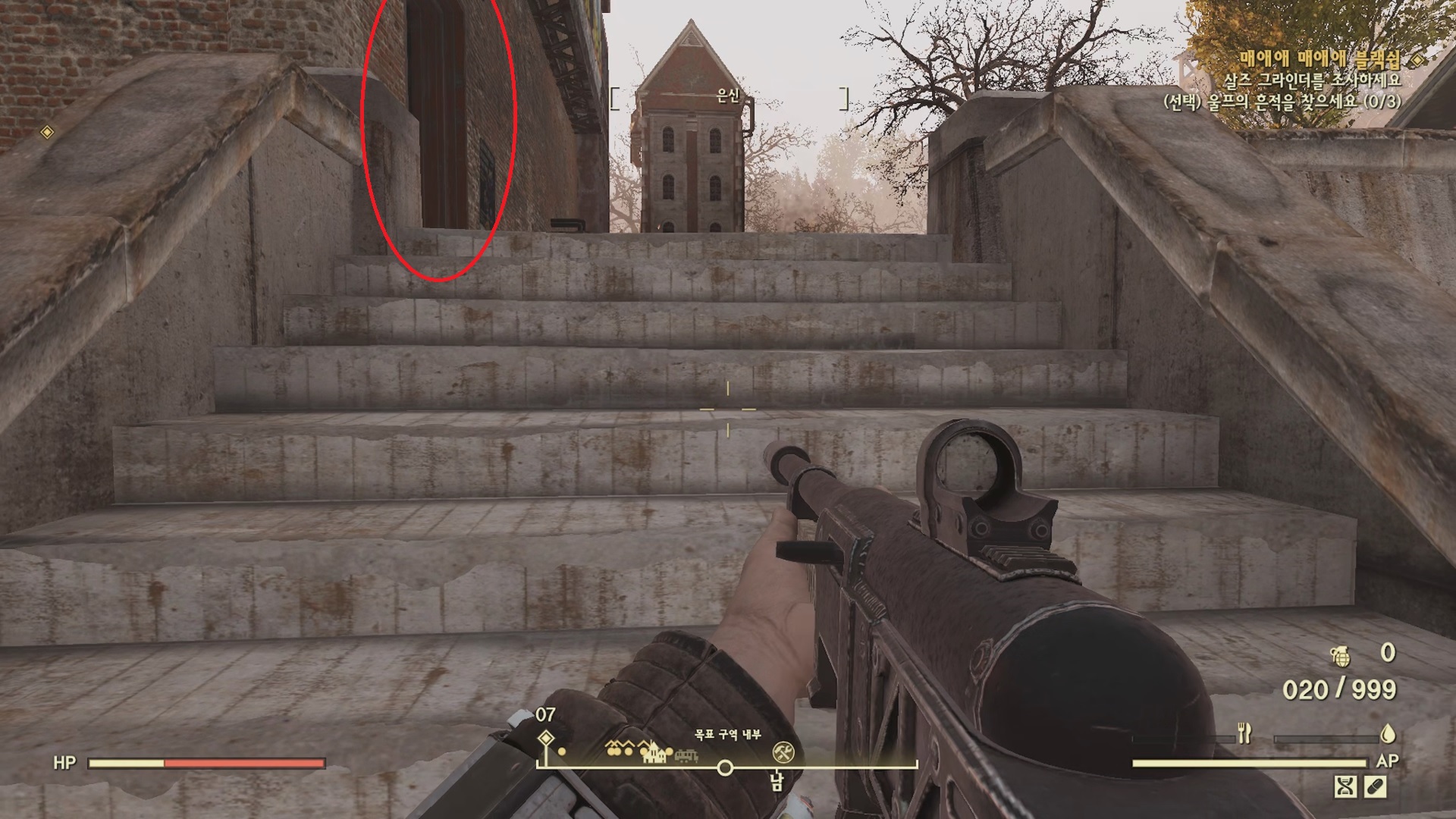 살즈 그라인더로 빠른 이동 후 쭉 직진하다보면 계단으로 올라가는 길이 있다. 올라가서 건물 뒤쪽으로 가서 계단 올라가면 들어가는 입구가 있다.