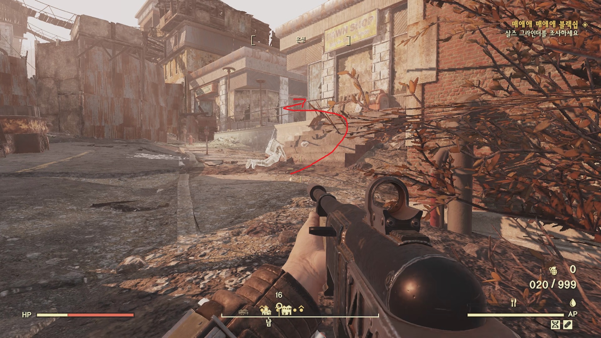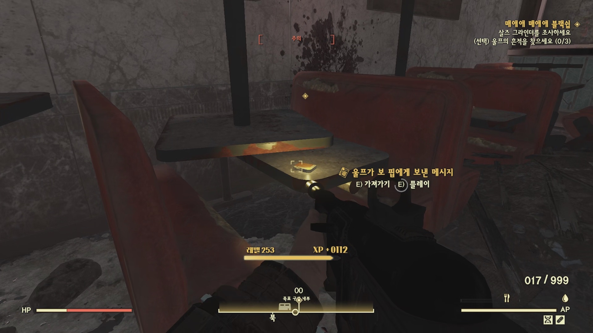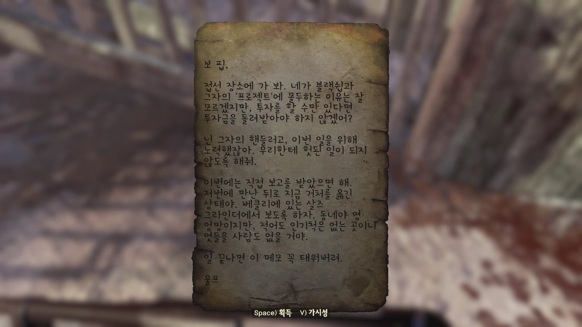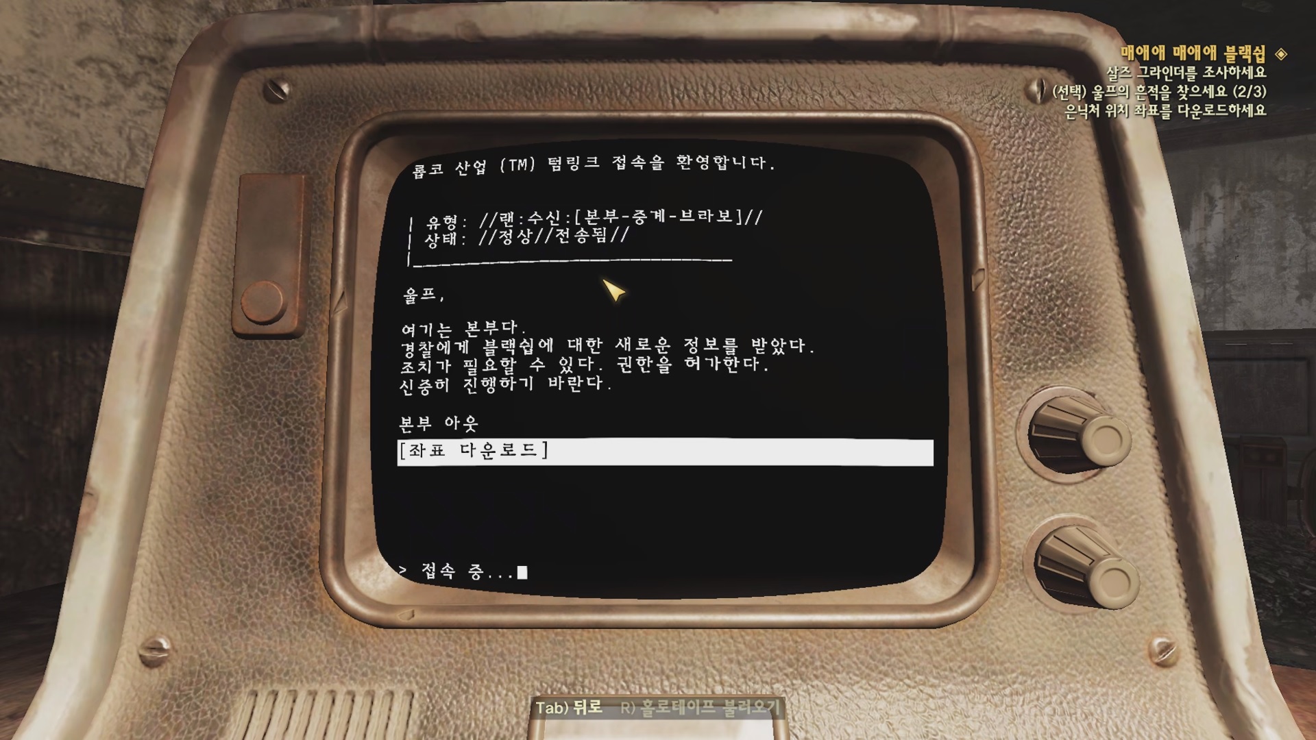 2층에 올라가면 살의 전용의 단말기가 있다. '본부 - 중계 - 브라보 => 체크인 #63 => 답변 보기 => 좌표 다운로드'를 선택하게 되면 퀘스트가 완료되고 '로우의 추락 (The Lowe-Down)'으로 이어진다.