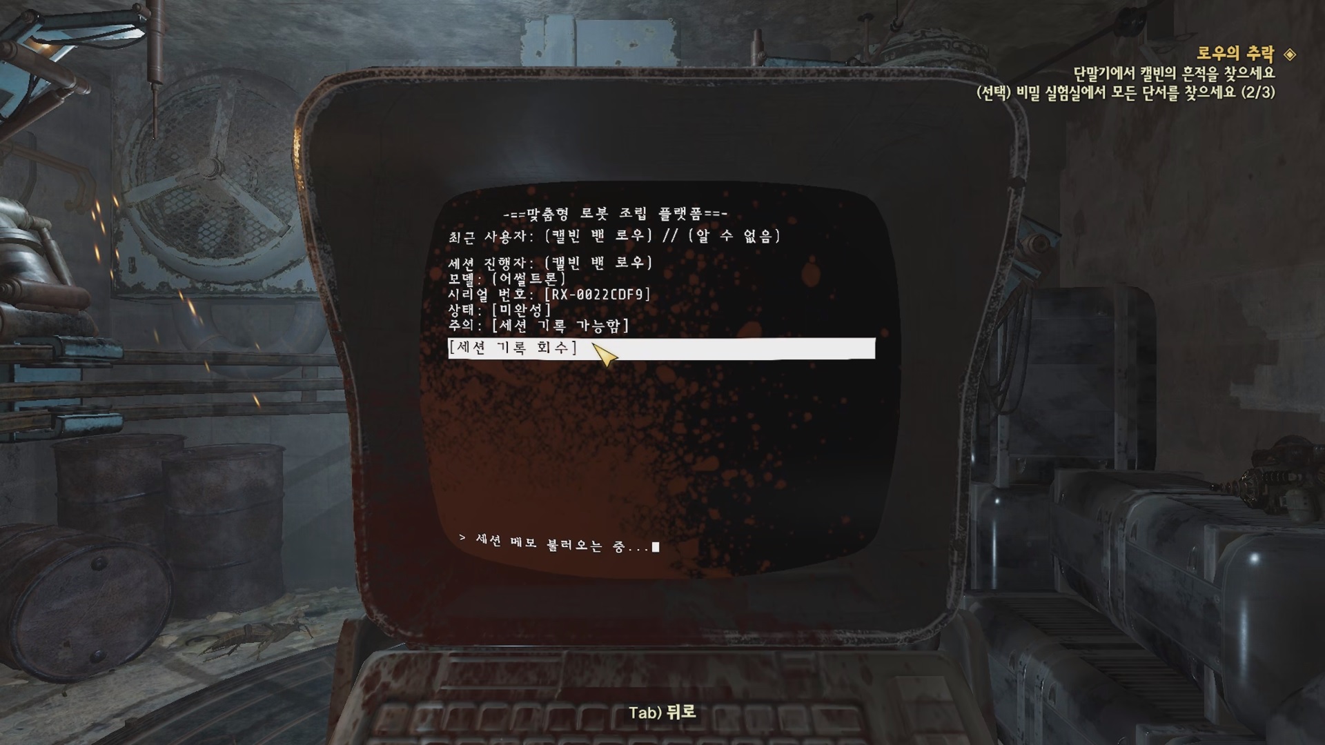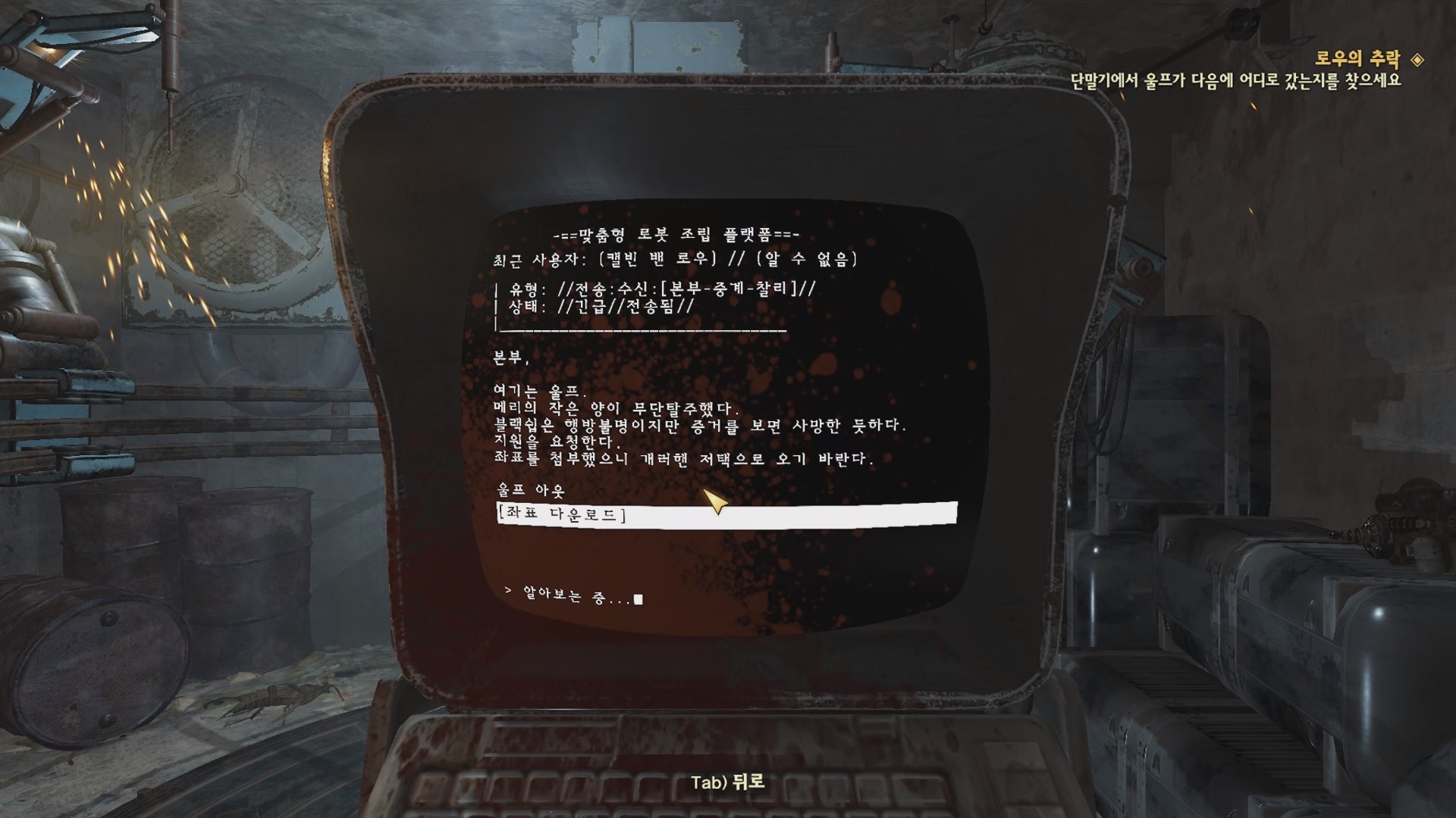 '상태 보고서 => 비상 체크인 => 좌표 다운로드'를 선택한다. 다음 목적지는 게러핸 저택이다. 좌표를 다운 받고 나면 퀘스트가 완료되고 '양 복장 울프 (Wolf in Sheep's Clothing)'로 이어진다.