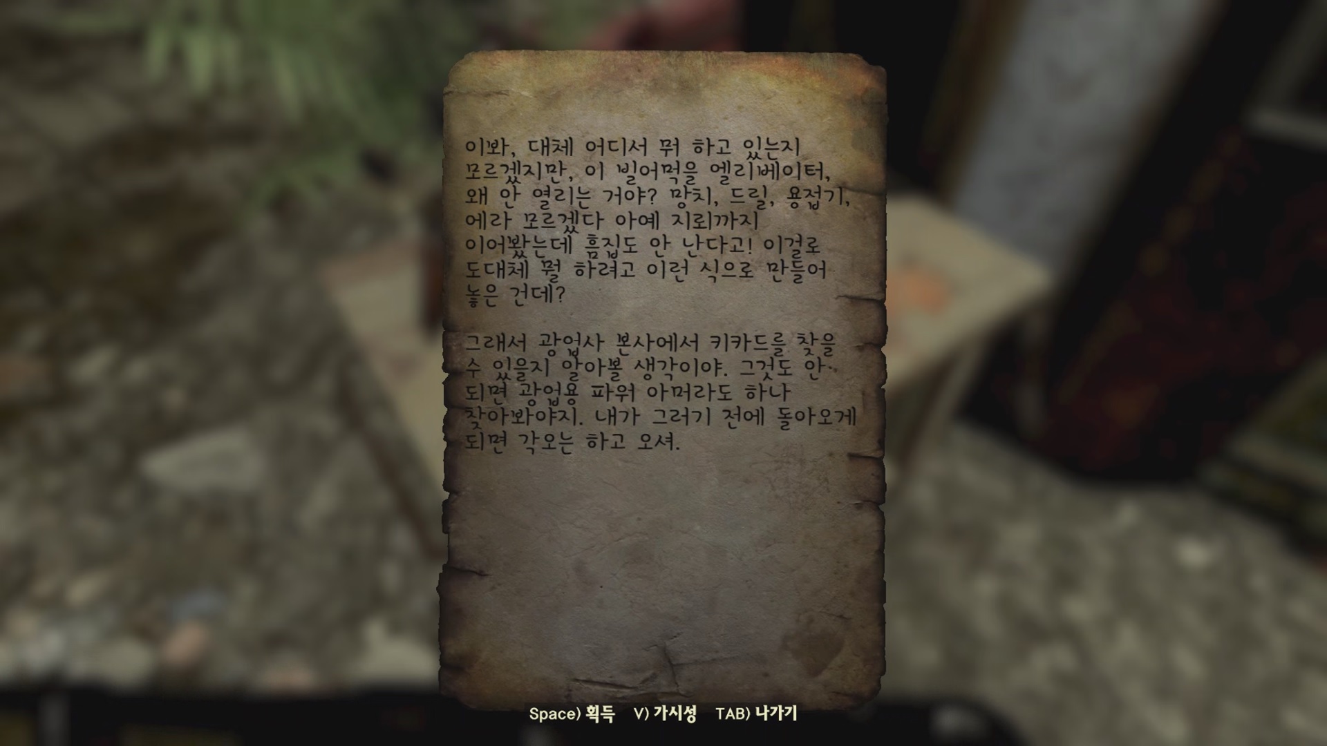 키카드를 못 찾은 다른 사람의 메모인데, 지뢰까지 설치해서 터뜨려도 흠집 하나 생기지 않았다고 한다. 역시, 부자들이 사는 집 답네. 광업사 본사에 키카드가 있는지 알아보러 간다고 한다. 광업용 파워 아머도 찾는다는 말이 있는걸 보니 원래 이걸 하면서 광부 파워 아머 얻는 퀘까지 덤으로 하게 만들 생각이었던 모양이다.