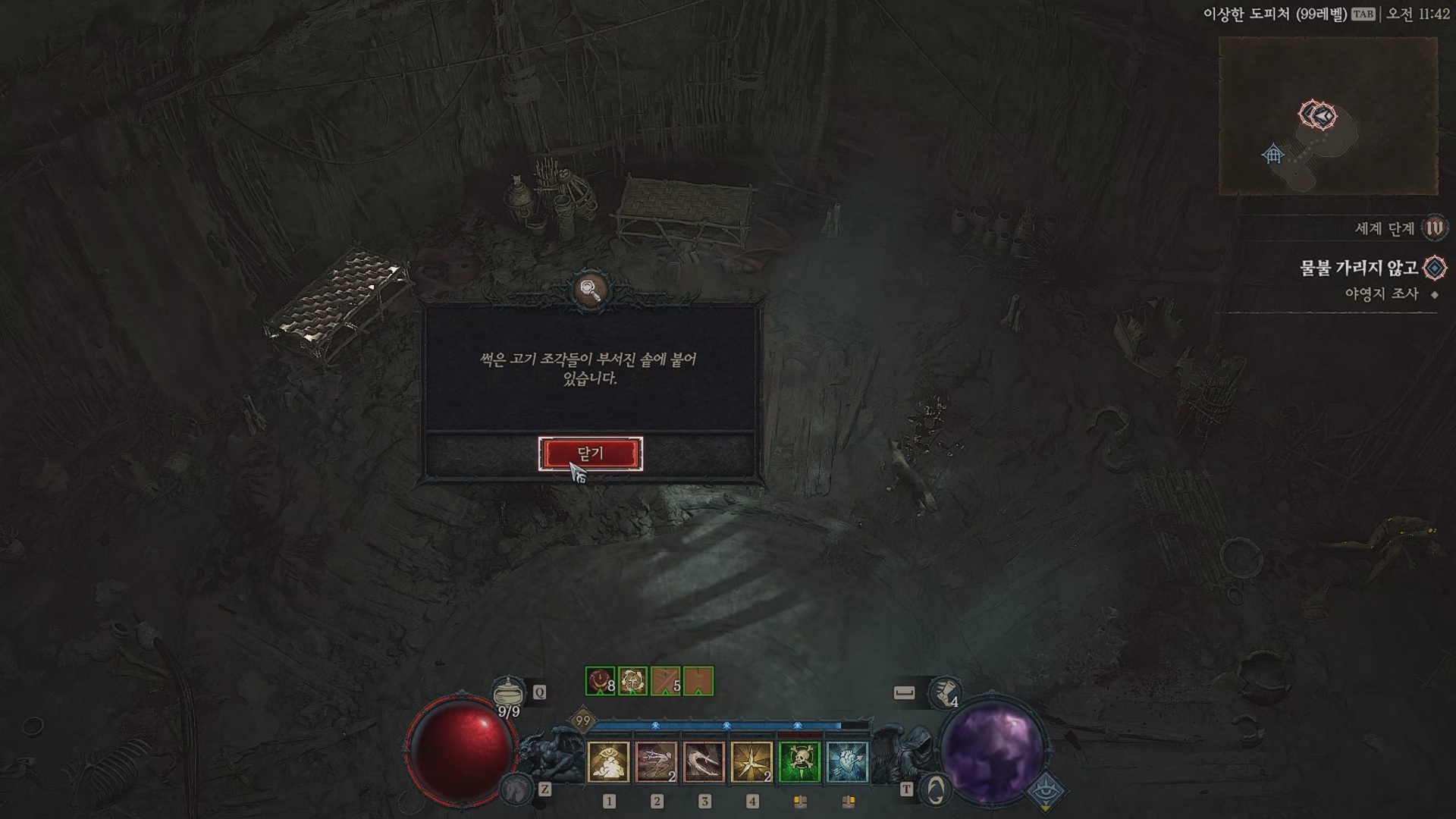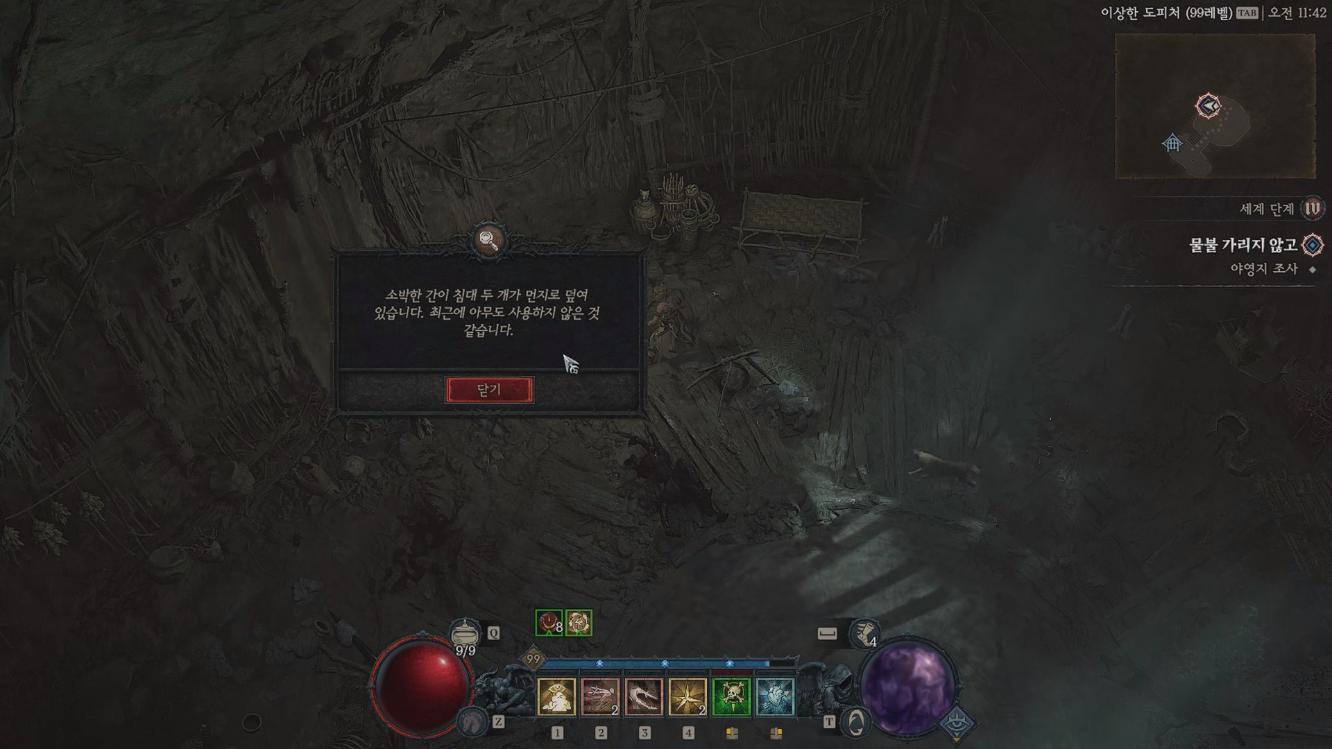 야생 동물 처치 후에 '반쯤 녹은 양초', '부서진 요리용 솥', '먼지투성이 간이 침대'를 조사하지만 아무런 단서를 얻지 못한다.