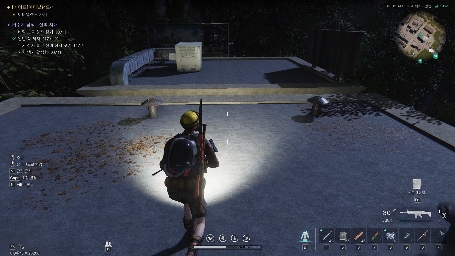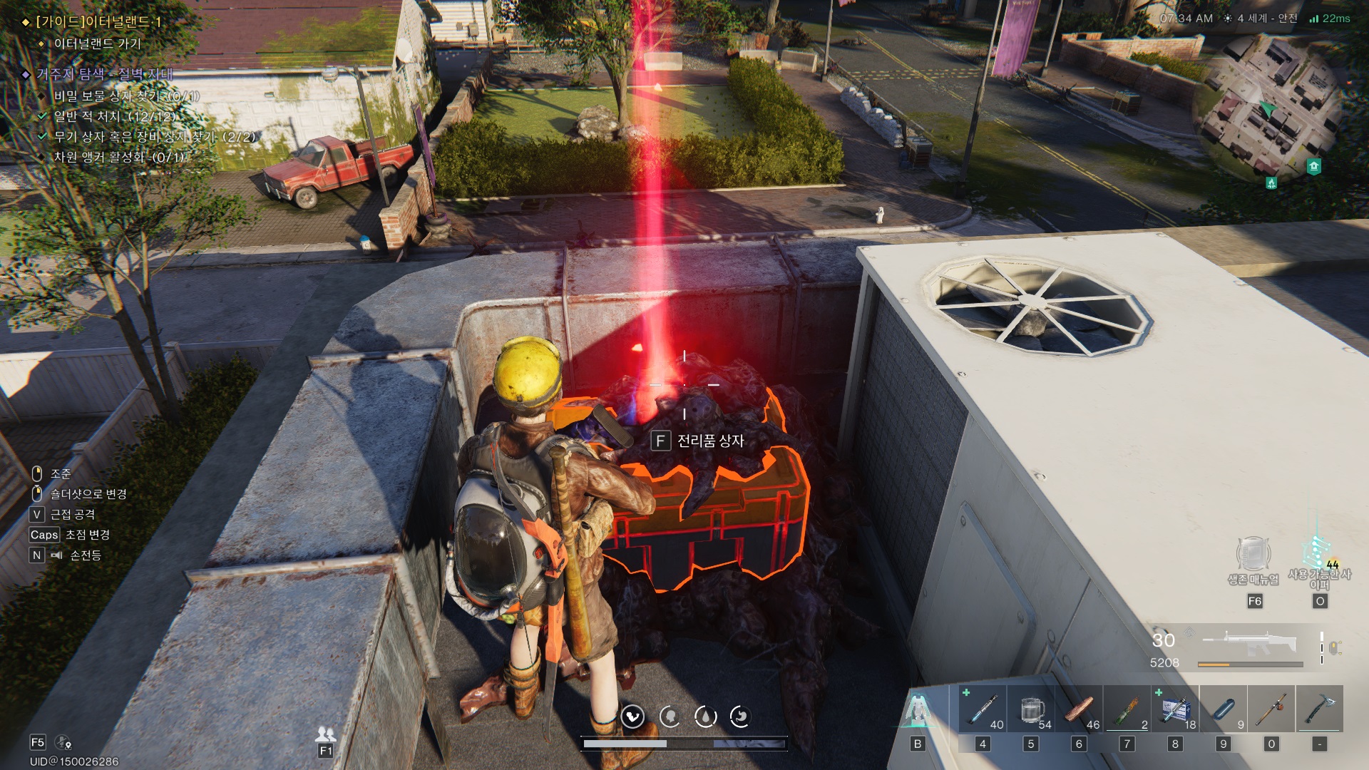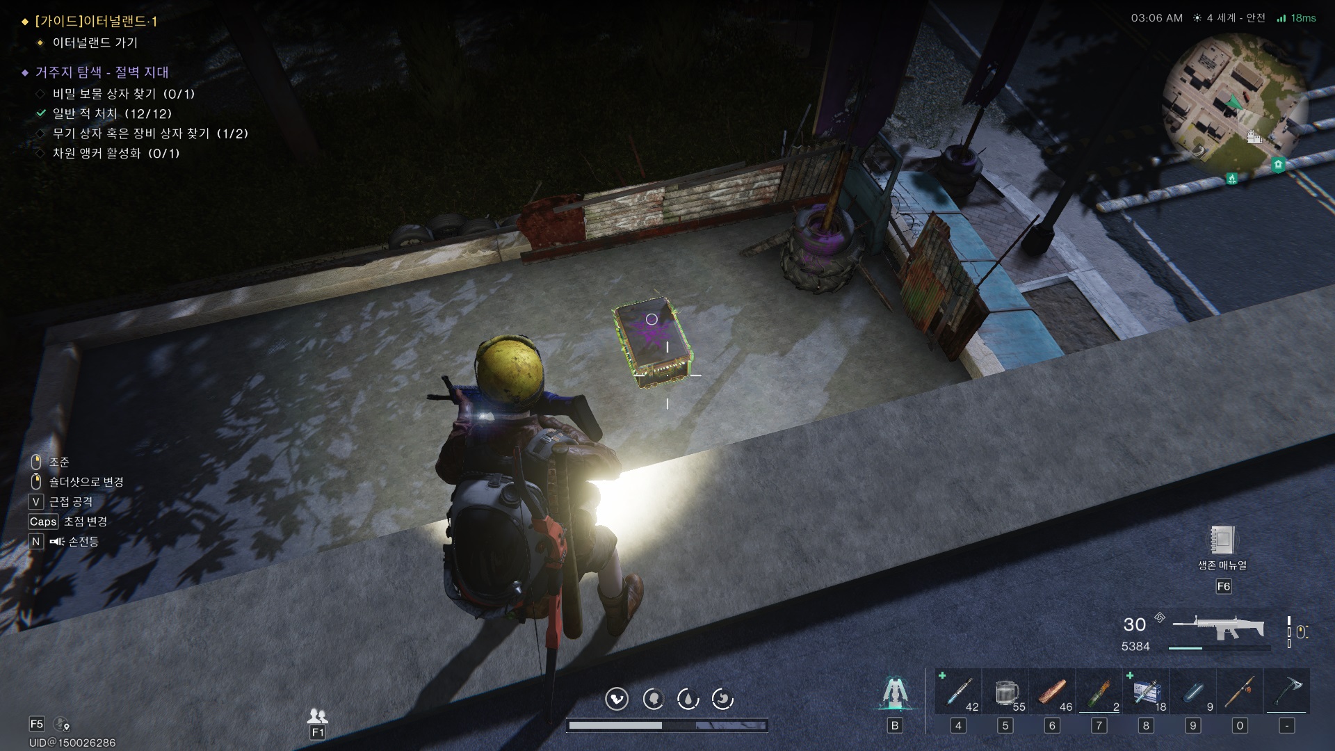 해당 위치로 가면 사다리가 있다. 위로 올라가서 옆집 옥상으로 점프, 그리고 옥상 밑에 이렇게 또 옥상이 있고 장비 상자가 있다.