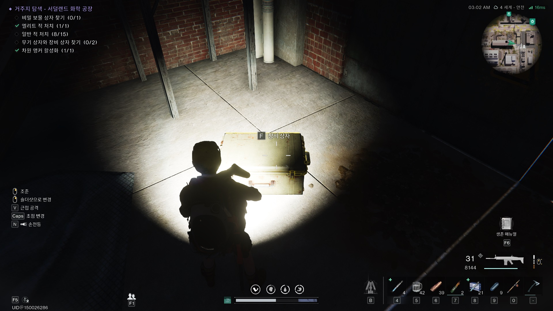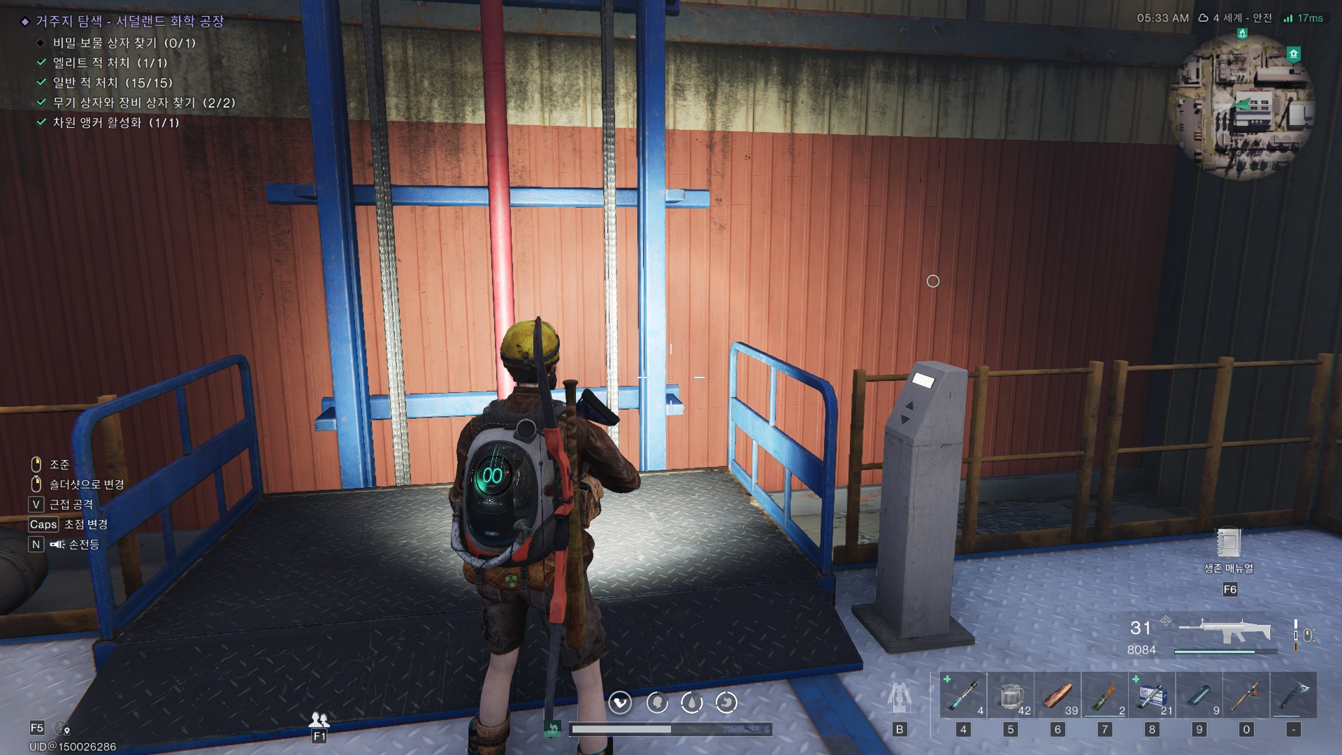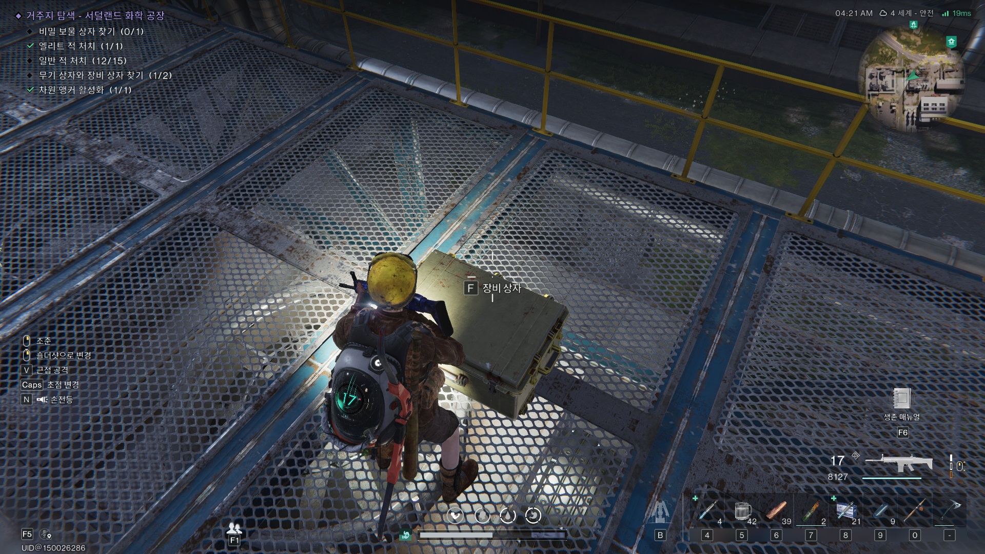 첫번째 장비 상자 먹으러 가는 공장 입구 서쪽편에 보면 올라가는 계단이 있고 그 위에 장비 상자가 있다. 우산 엘리트 몹이 지키고 있다.