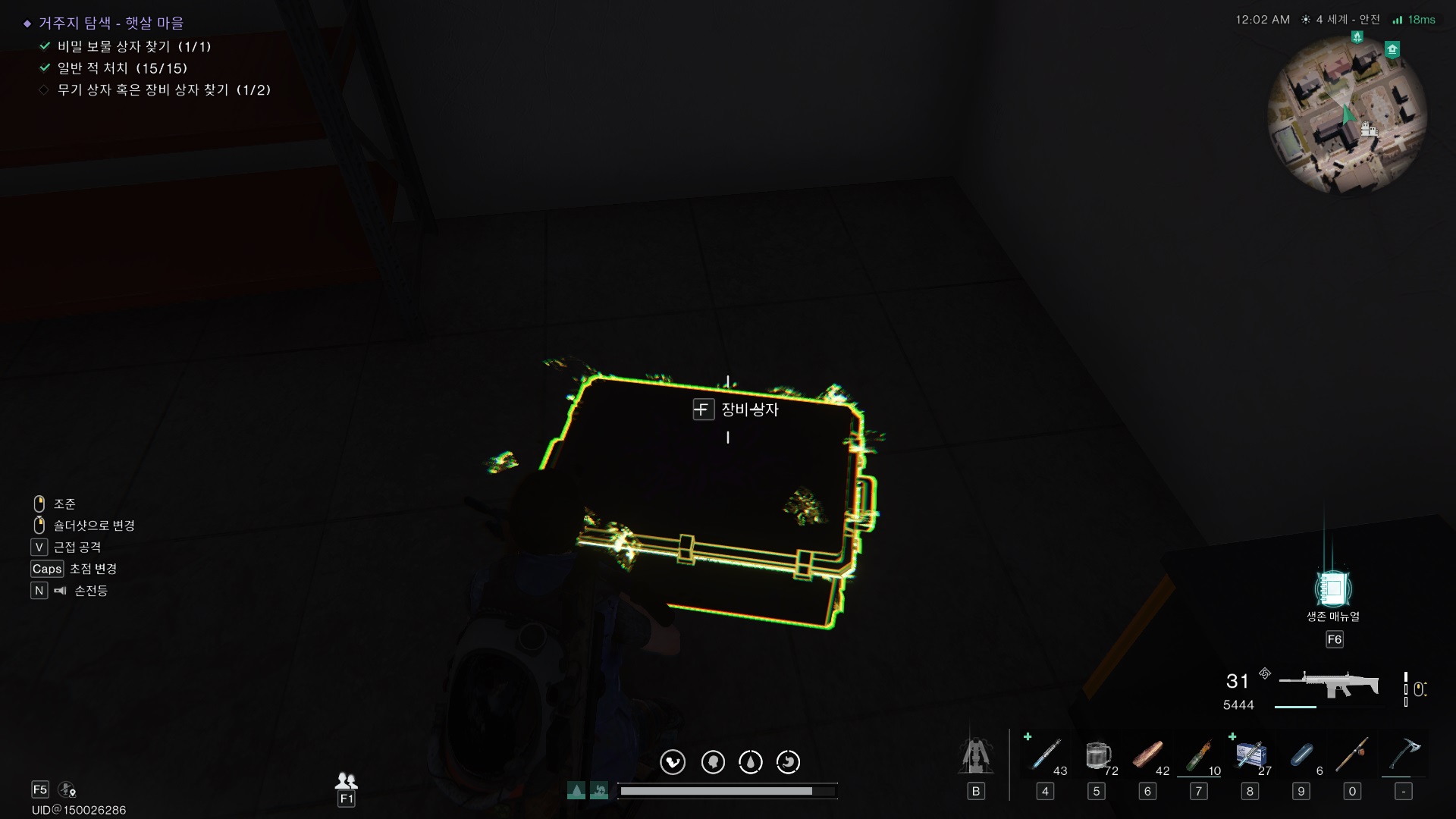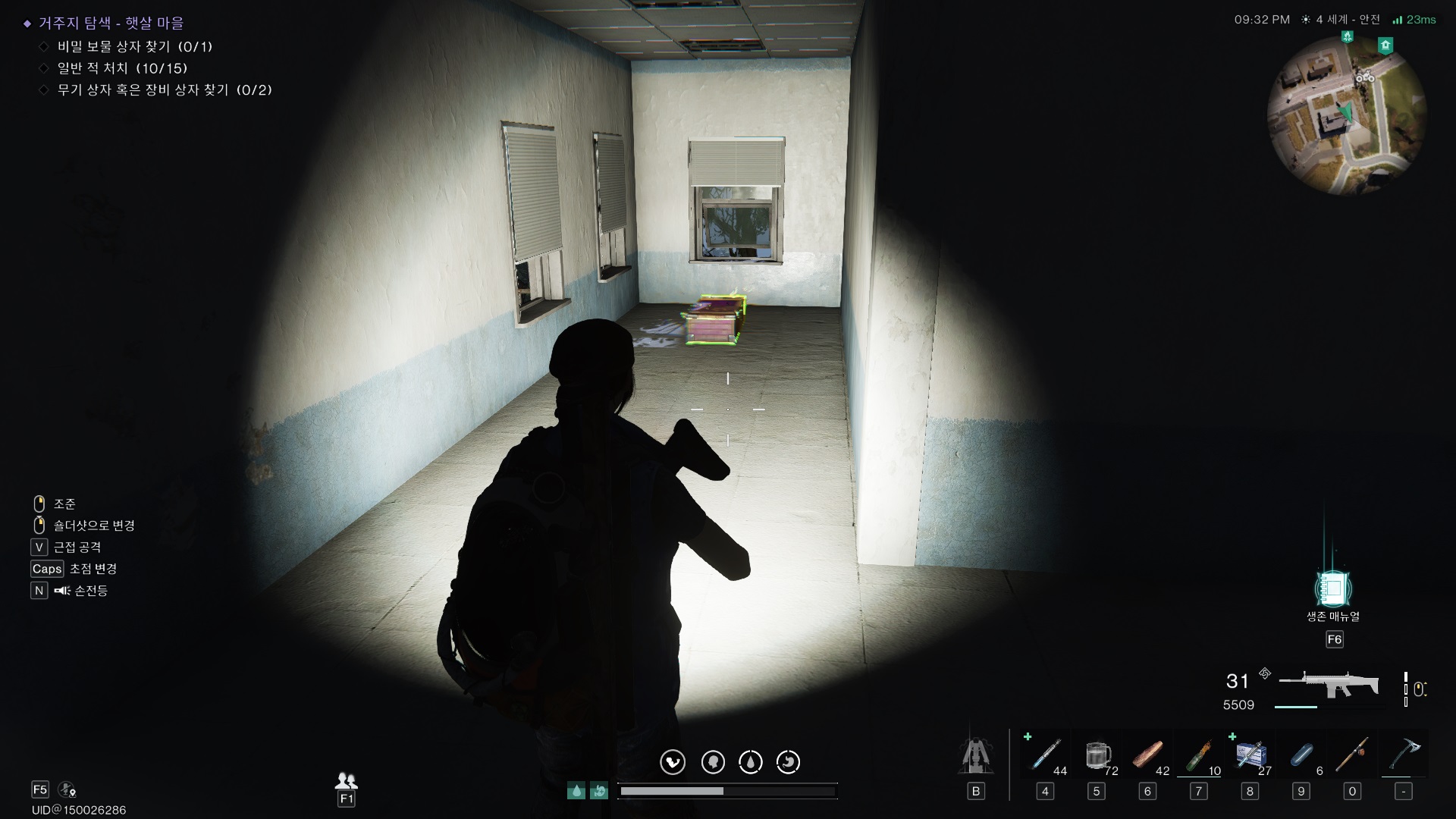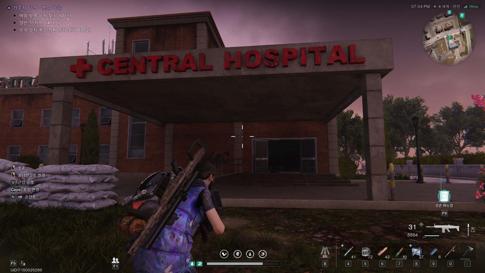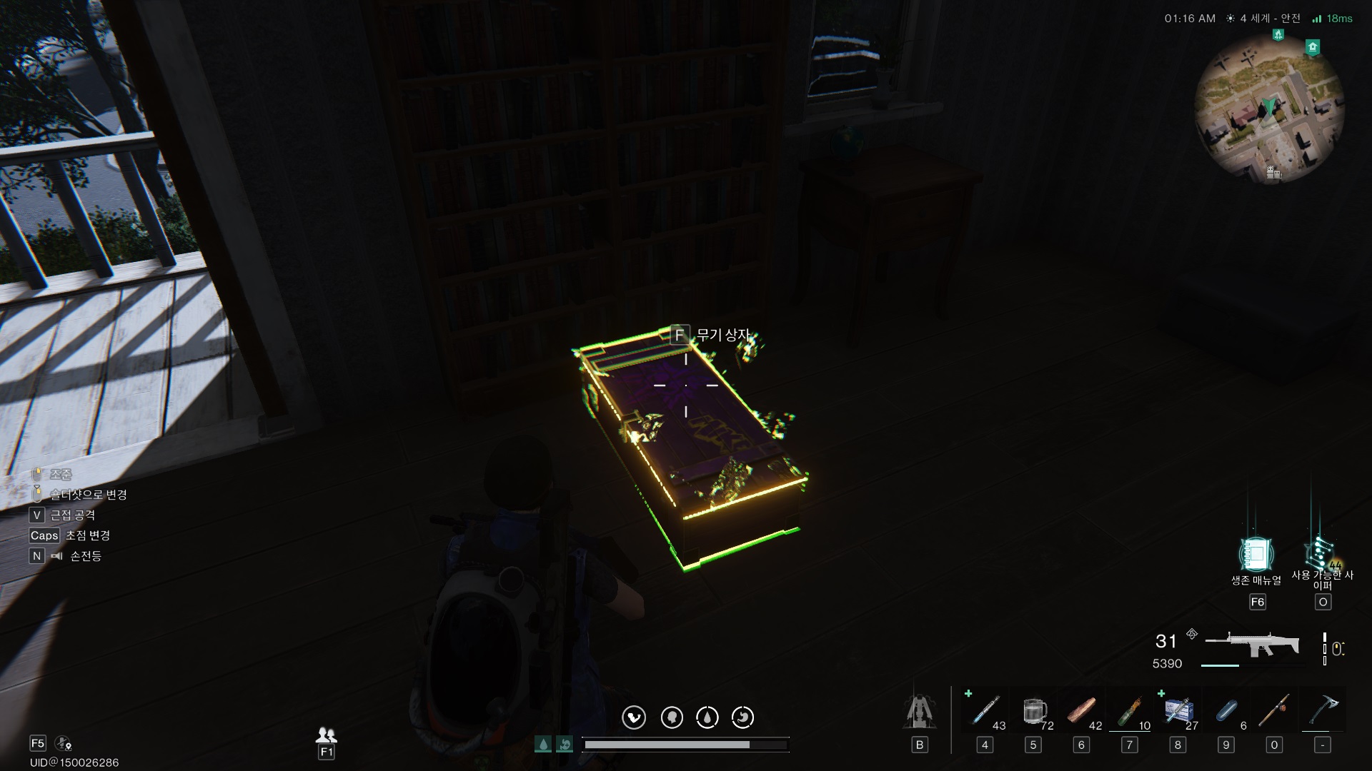 첫번째는 해당 위치 병원의 2층에서 계단으로 올라와서 왼쪽(지도상 서쪽)으로 가면 코너가 나오고 무기 상자가 있다.