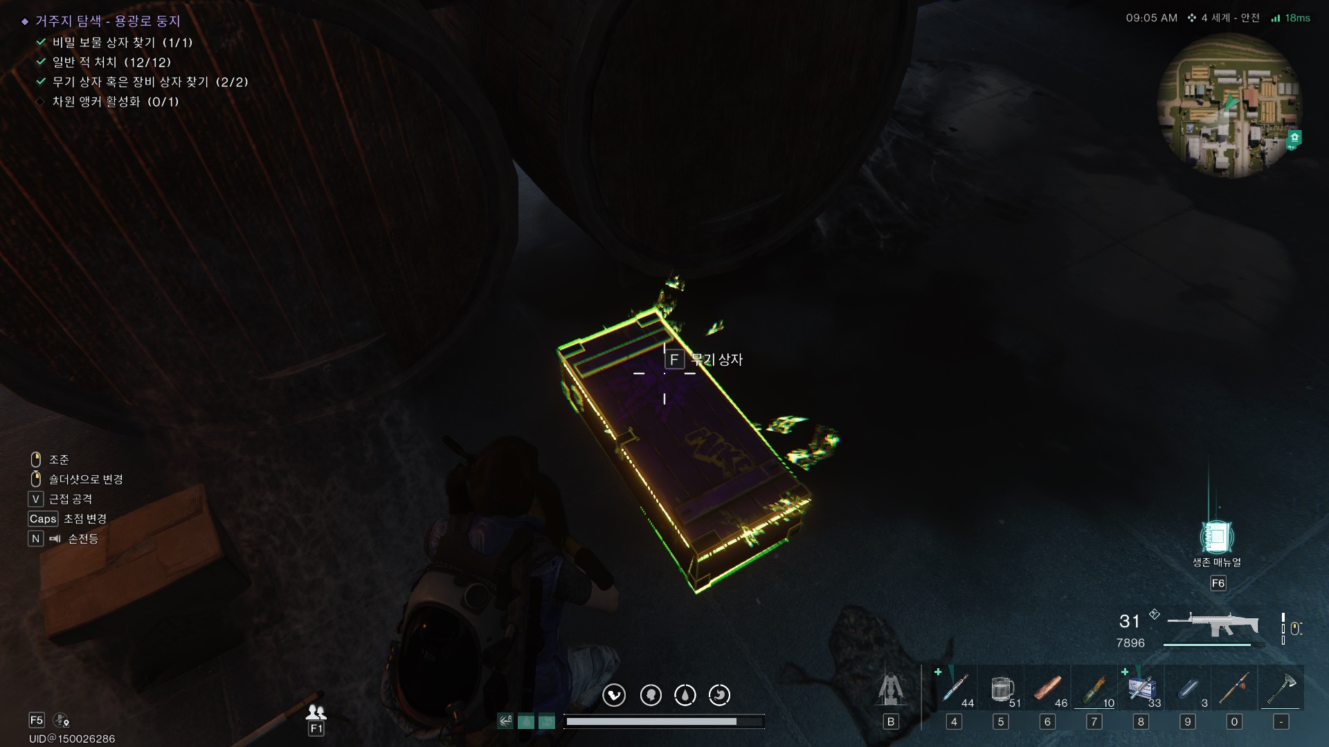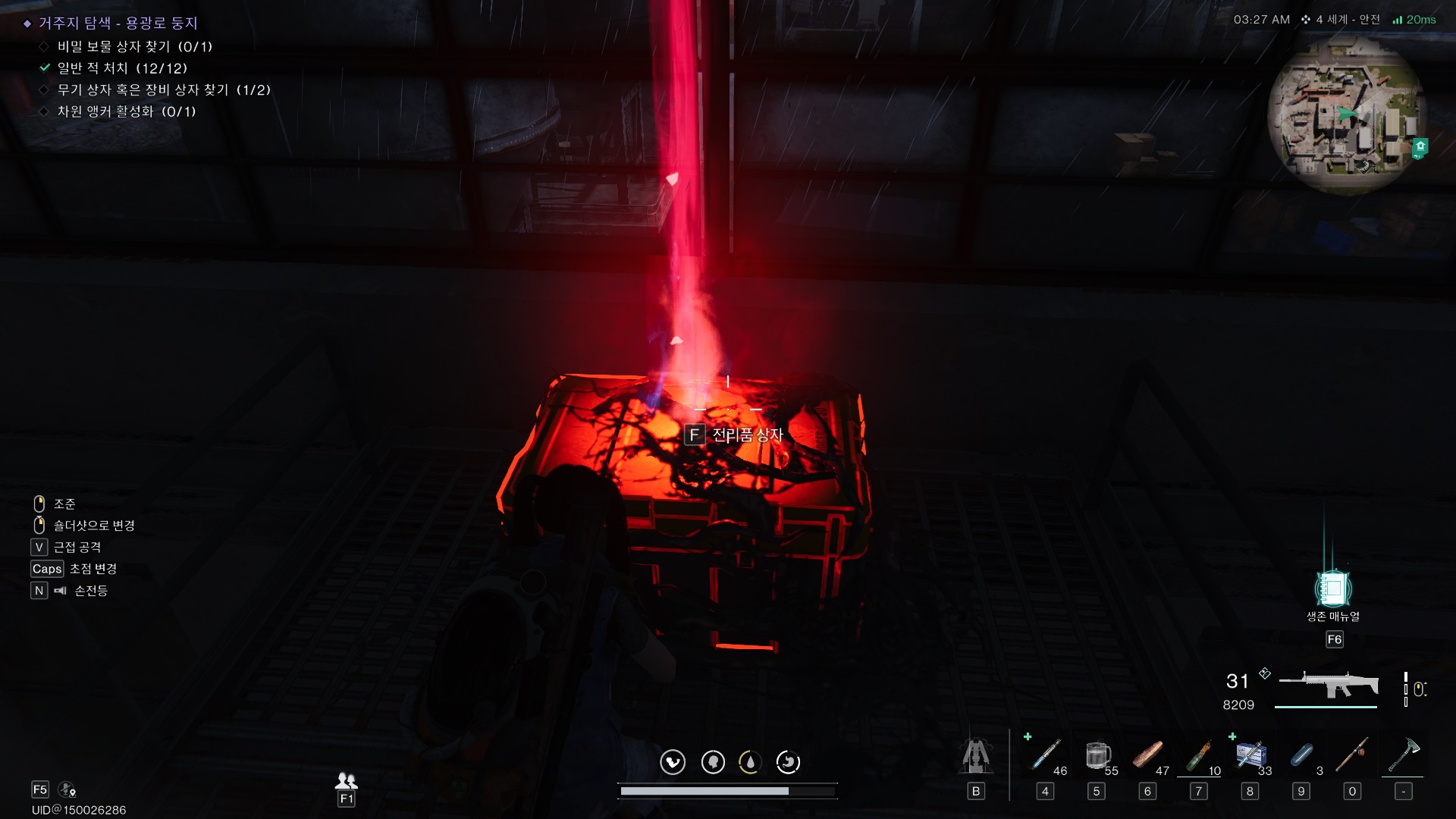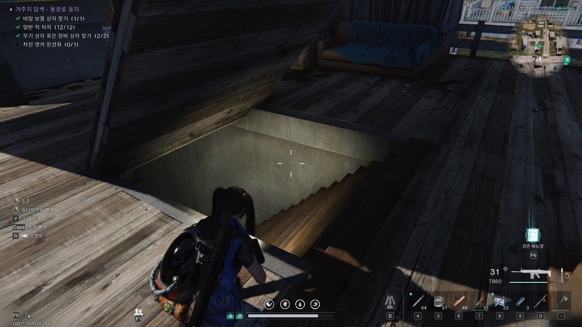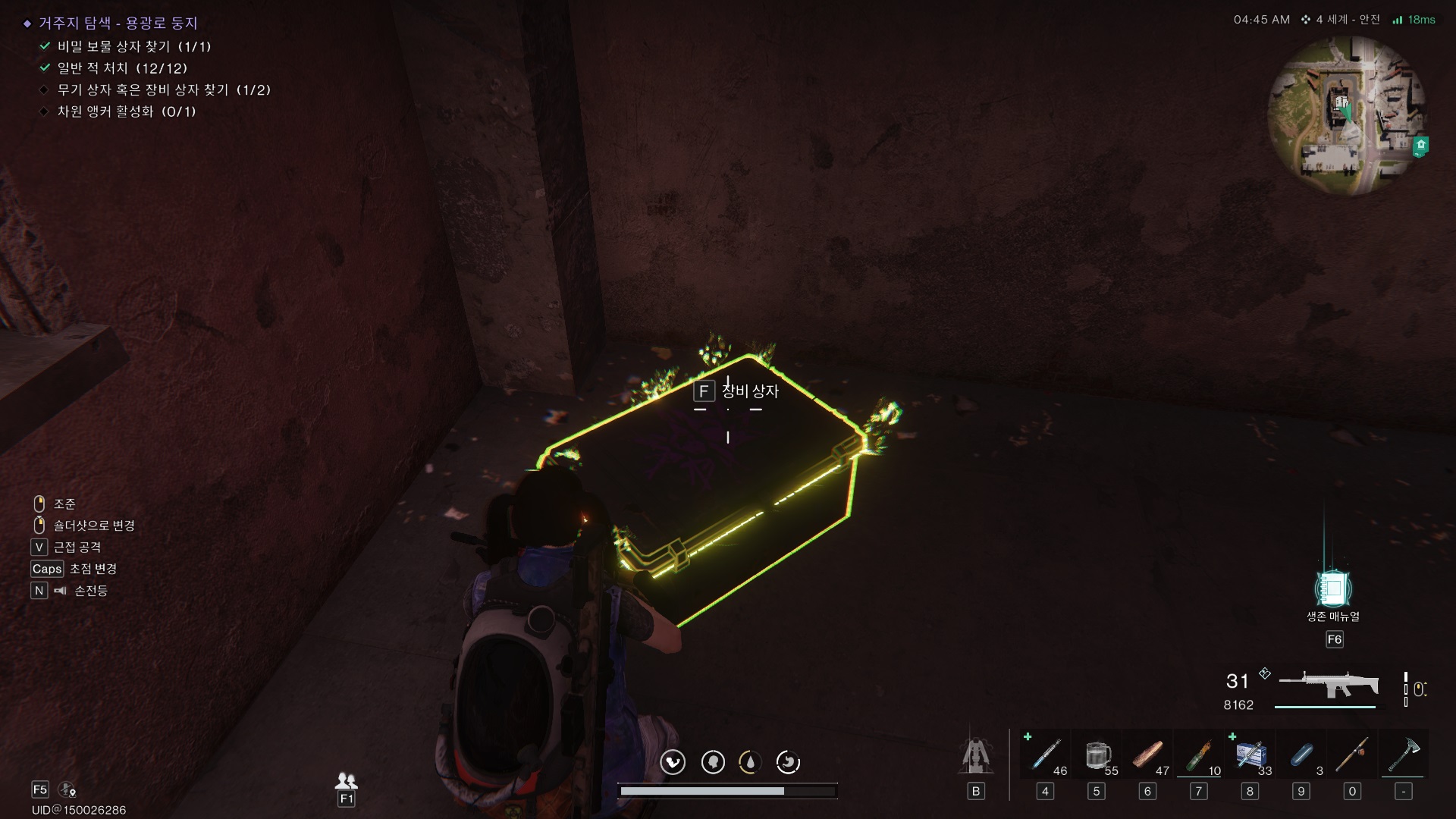 해당 위치로 가면 외부에 2층으로 가는 계단이 있는데 올라가서 왼쪽에 보이는 방 안에 장비 상자가 있다.