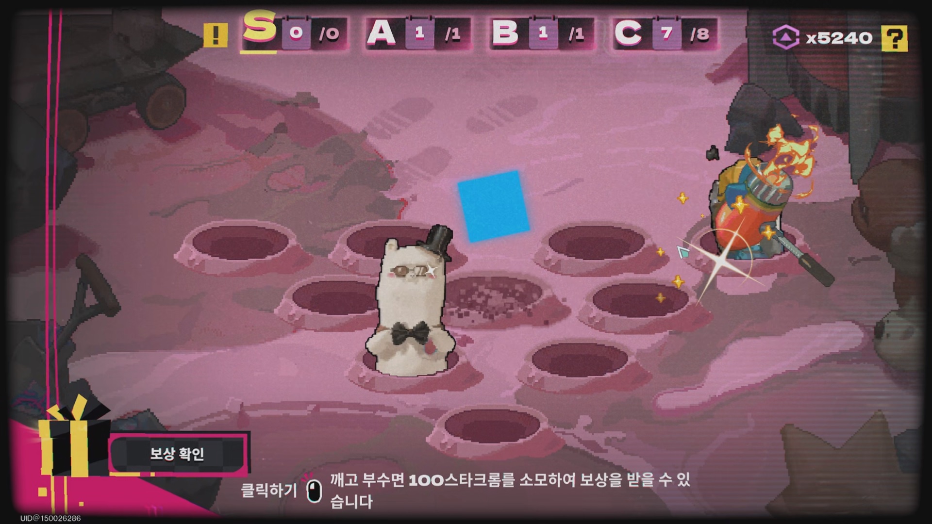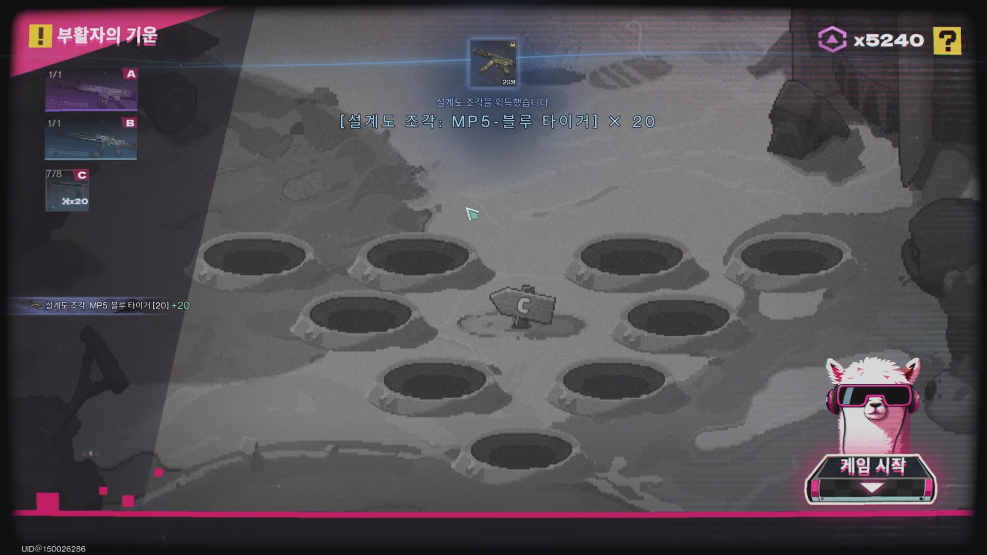 두더지 잡기 게임 형식인데, 때려 잡을때마다 랜덤으로 설계도 조각을 준다. 지금 저 5240개... 결국 저거 다 날리고 얻은건 SCAR - 아웃사이더. 그냥 더 모았다가 SCAR 최후의 용기를 살걸 그랬다.