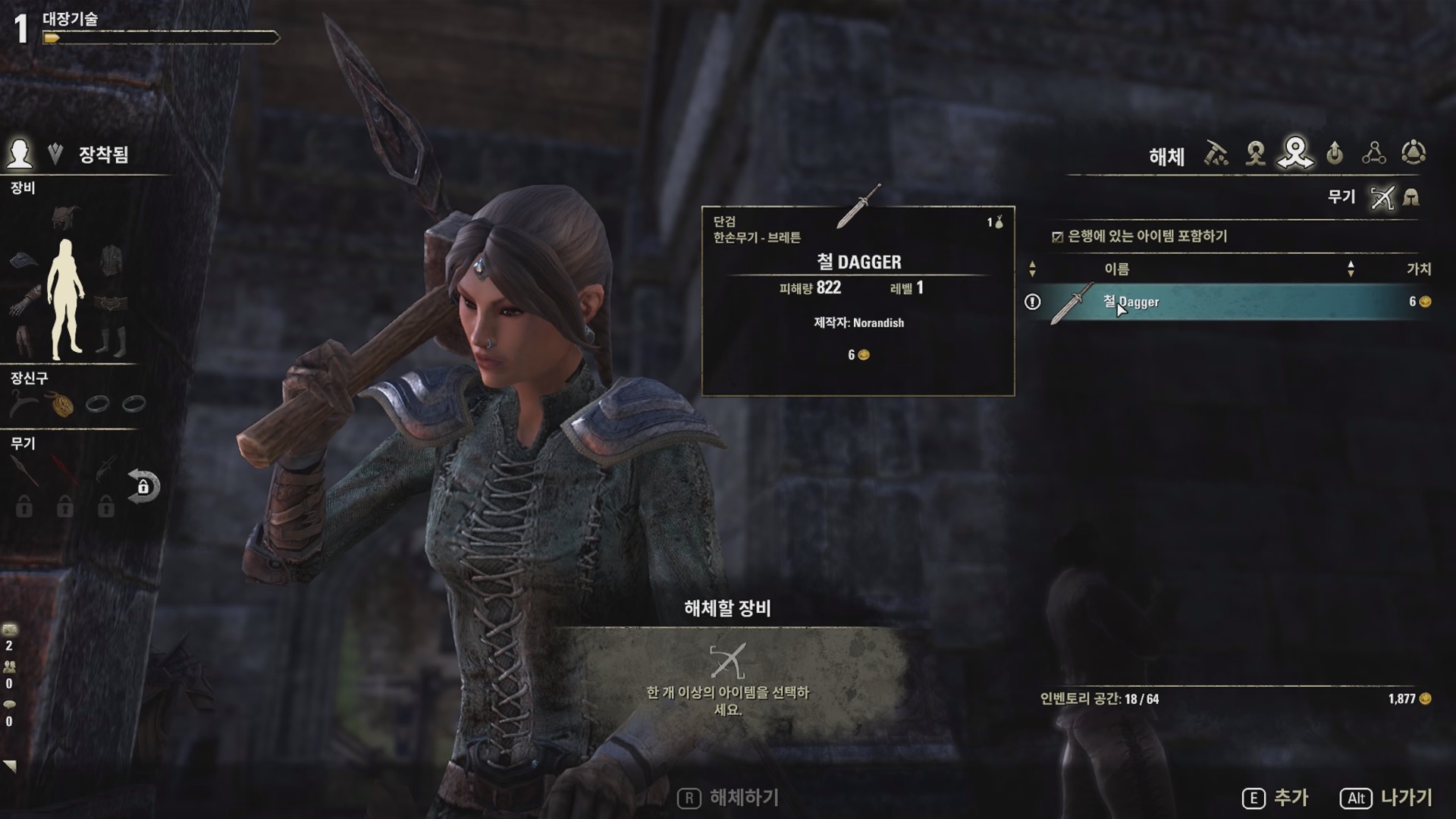 철 단검을 만들면 이제 해제에 대해서 알려준다. 해제를 통해 숙련도를 올릴 수 있다고 하니 만드는 것보단 더 나을려나. (하지만 골드 압박에 해제는 커녕 팔기 바쁜데....)