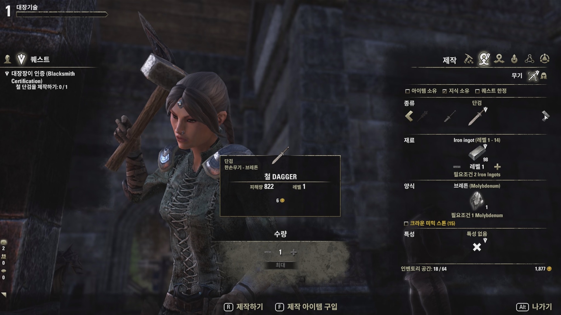 간단하게 '철 단검'을 하나 만들어 오라고 한다.