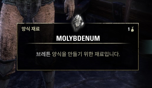 양식 재료들이 다양한데, 그 밑에 설명에 보면 Molybdenum 의 경우 '브레튼' 양식을 만들기 위한 재료입니다. 라고 설명되어 있다. 해당 퀘스트 진행 하는 종족이 브레튼이기에 이 양식 아이템이 꼭 들어간다는거다. 보통 해당 지역의 대장장이들이 이 양식 재료는 판다. 아이템 분해시에 아이템의 양식에 따라서 재료가 나온다. 자기 종족 양식이라면 꼭 모아두자.