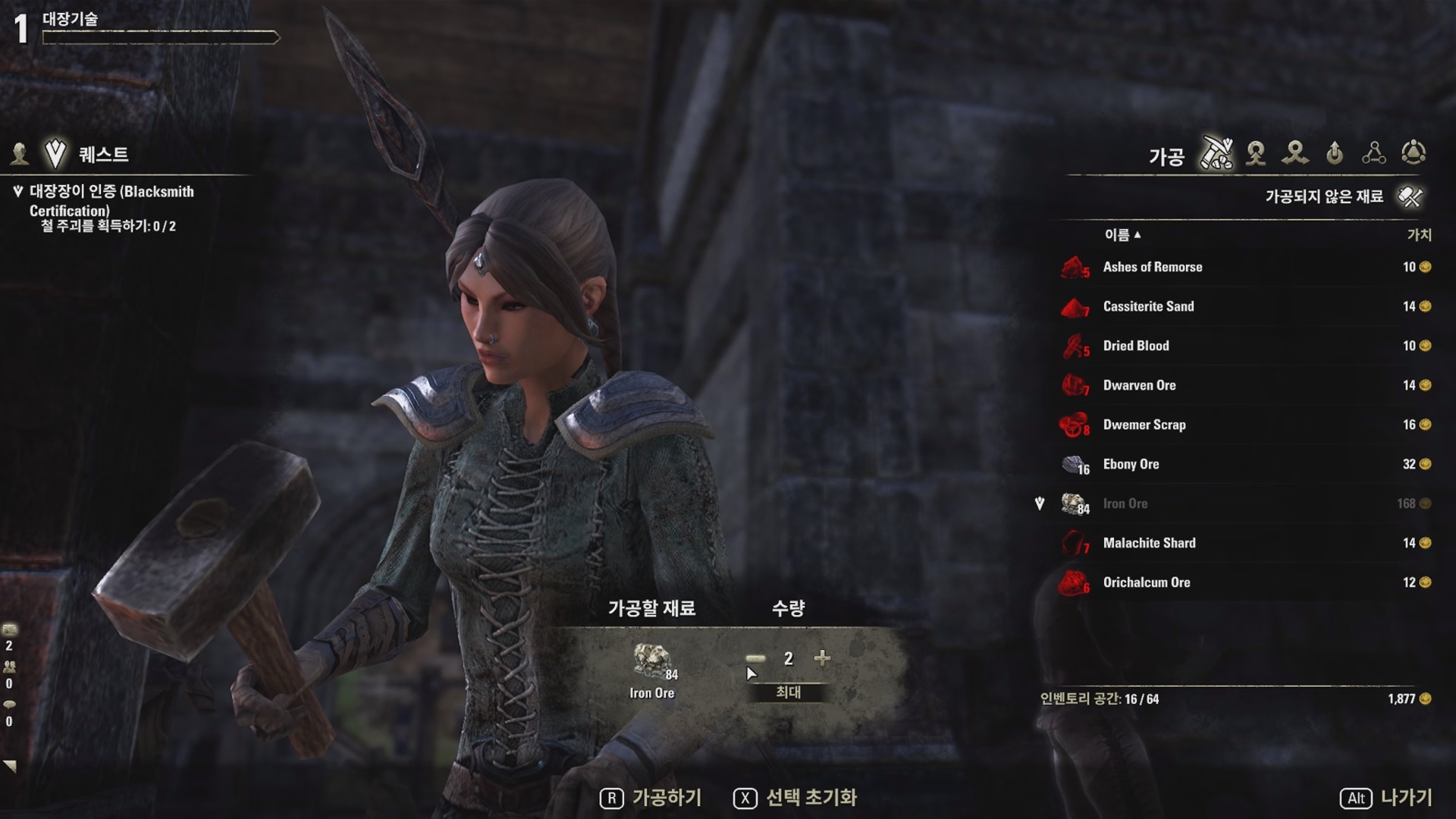 철광석 10개를 캔 후에 밀레니스와 대화 후 대장기술 제작대로 가서 철광석을 제련하자. 철광석 10개당 철주괴는 7~10개 나온다.