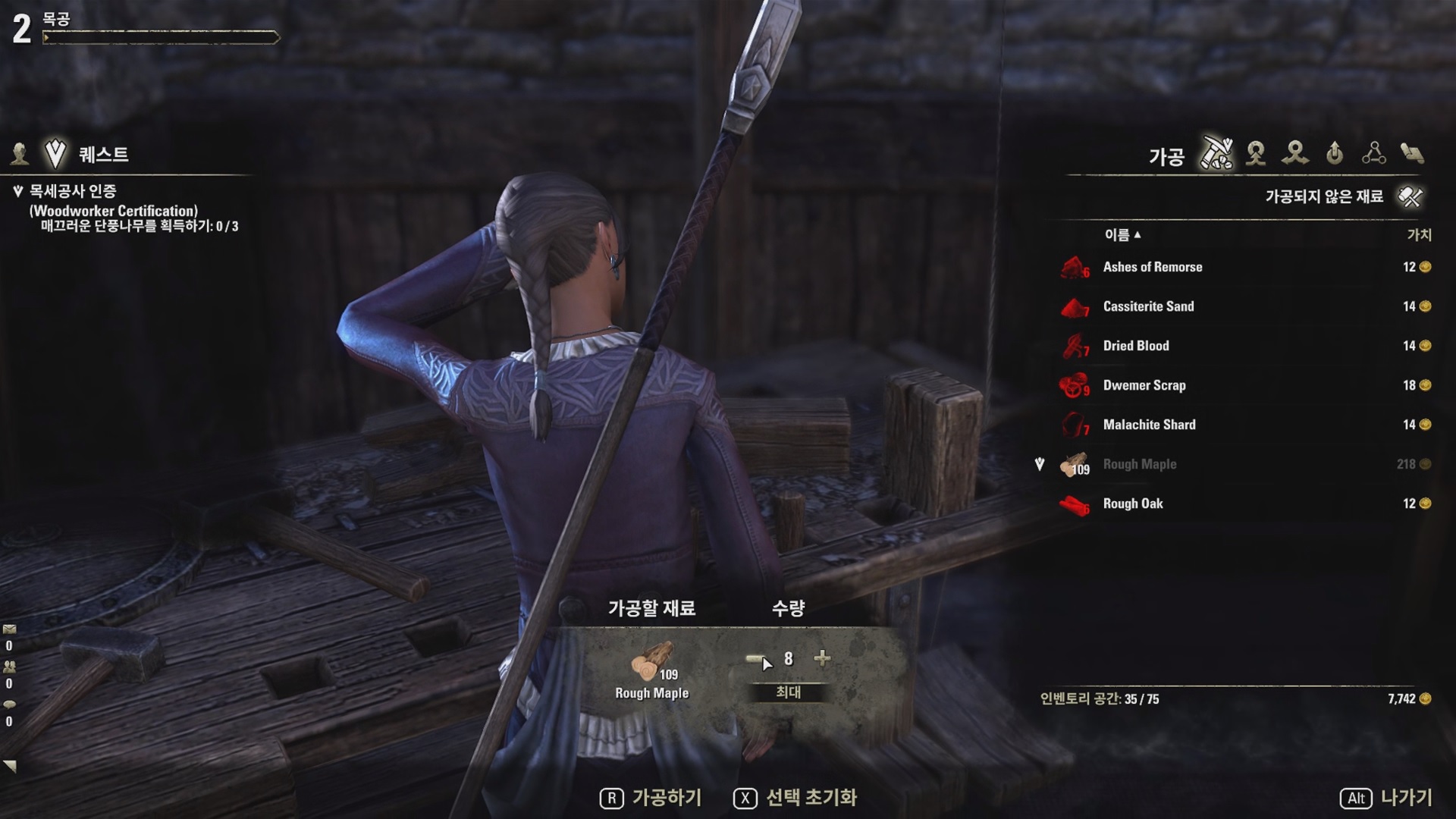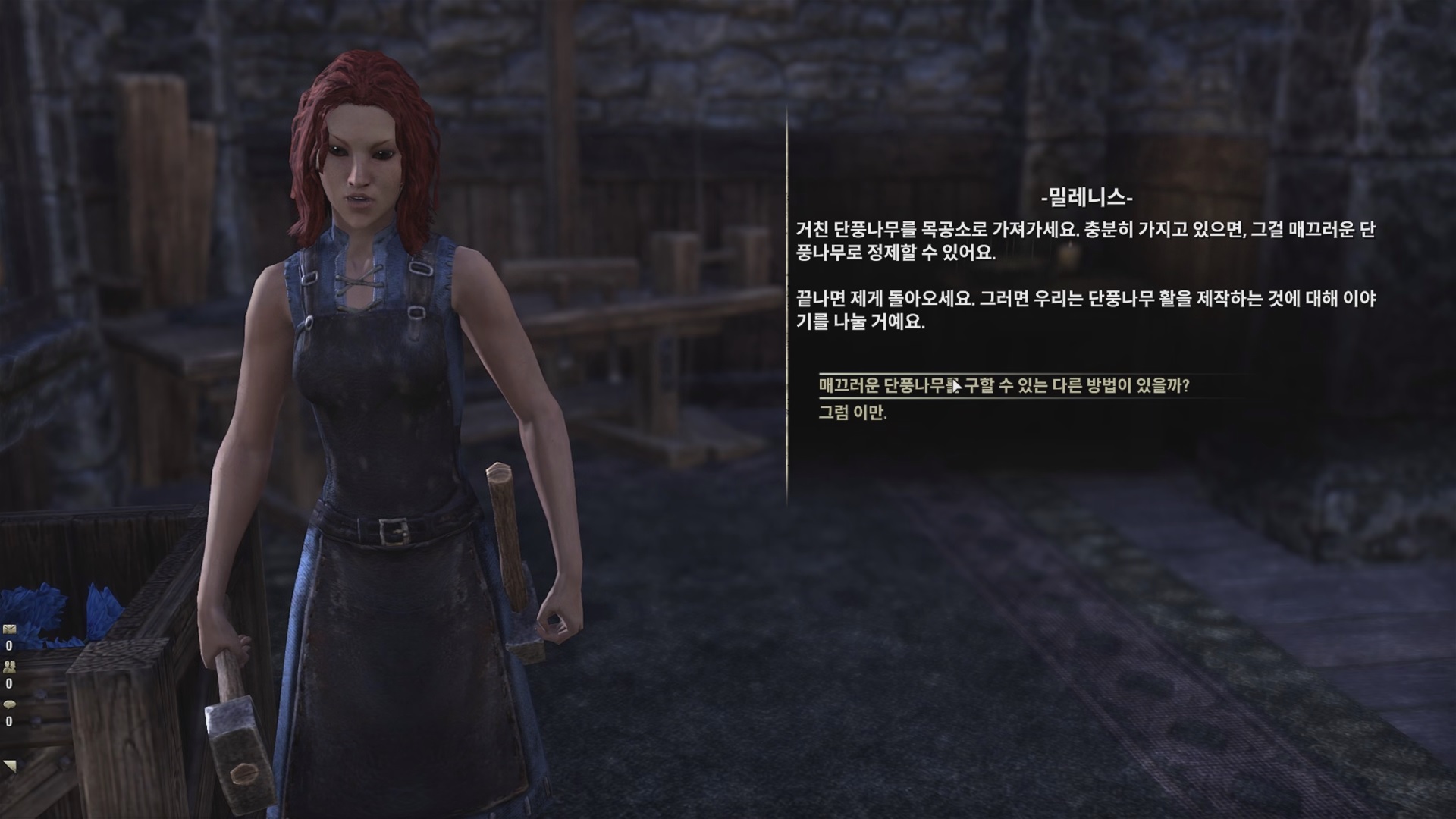 거친 단풍나무 채취 후에 목공소에 가서 밀레니스와 대화하면 매끄러운 단풍나무로 정제를 하라고 한다.