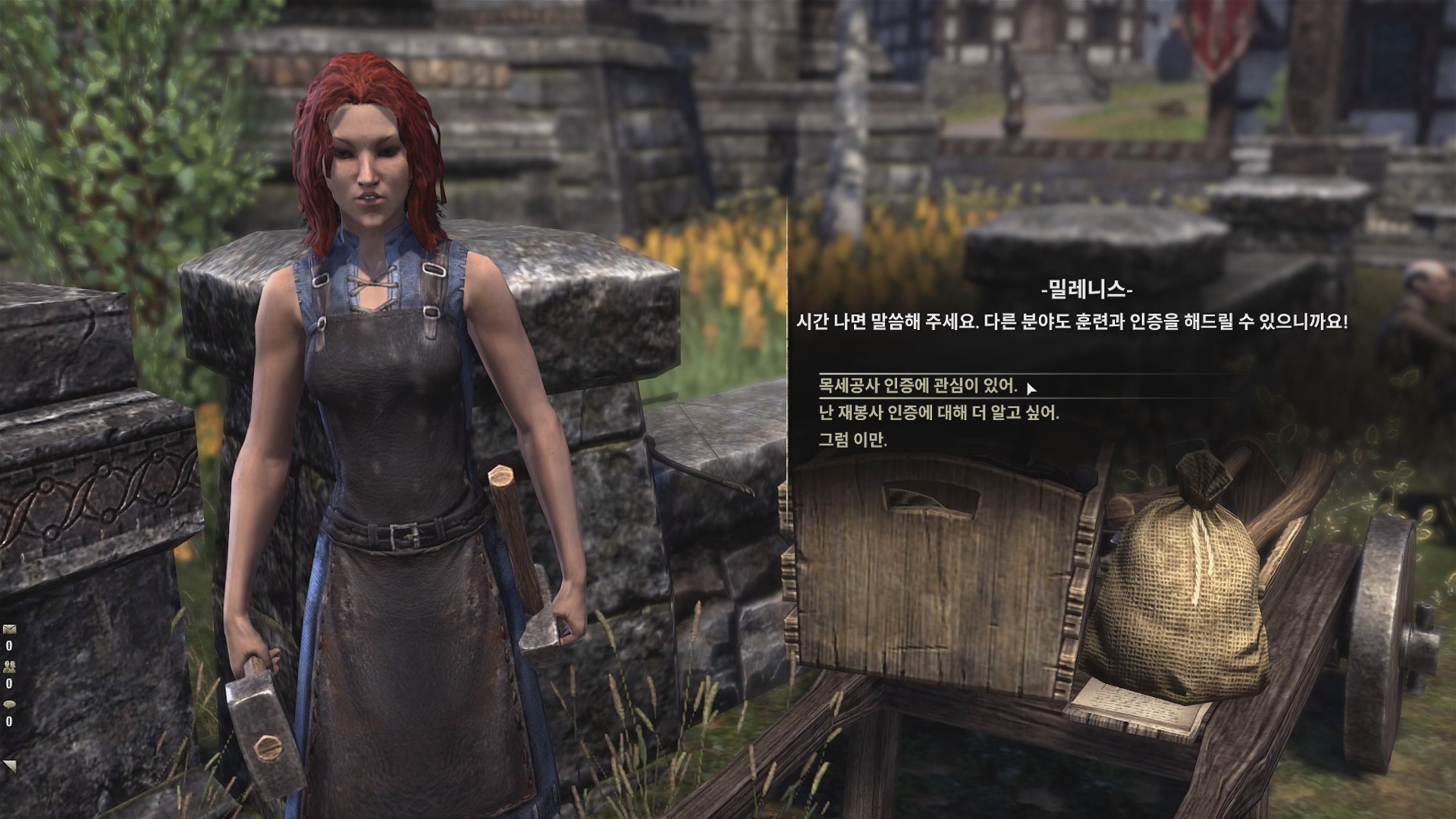 파이트 길드 앞에 있는 밀레니스와 대화해서 목세공사 인증에 관심이 있다고 하자.