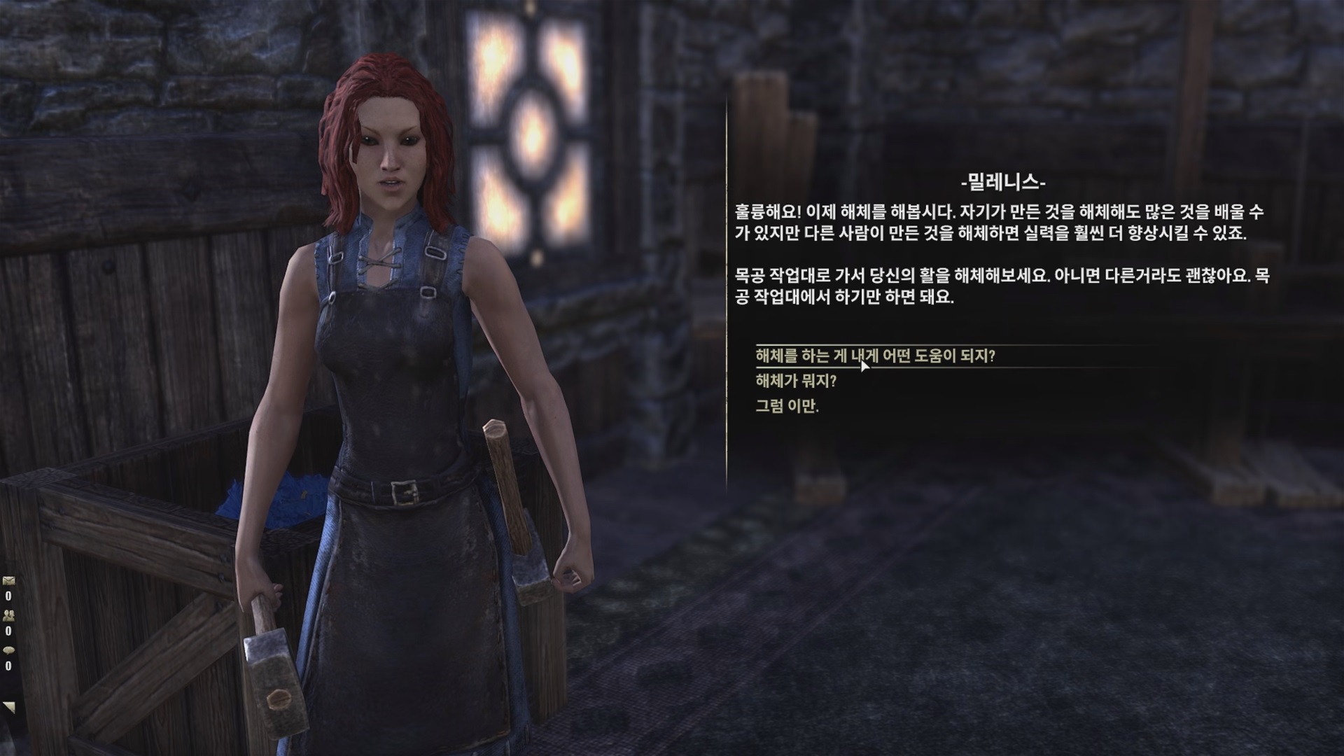 분해 한 뒤에 밀레니스와 대화하면 퀘스트가 완료되고 이후 목공 제작 일일 퀘스트를 받을 수 있다.