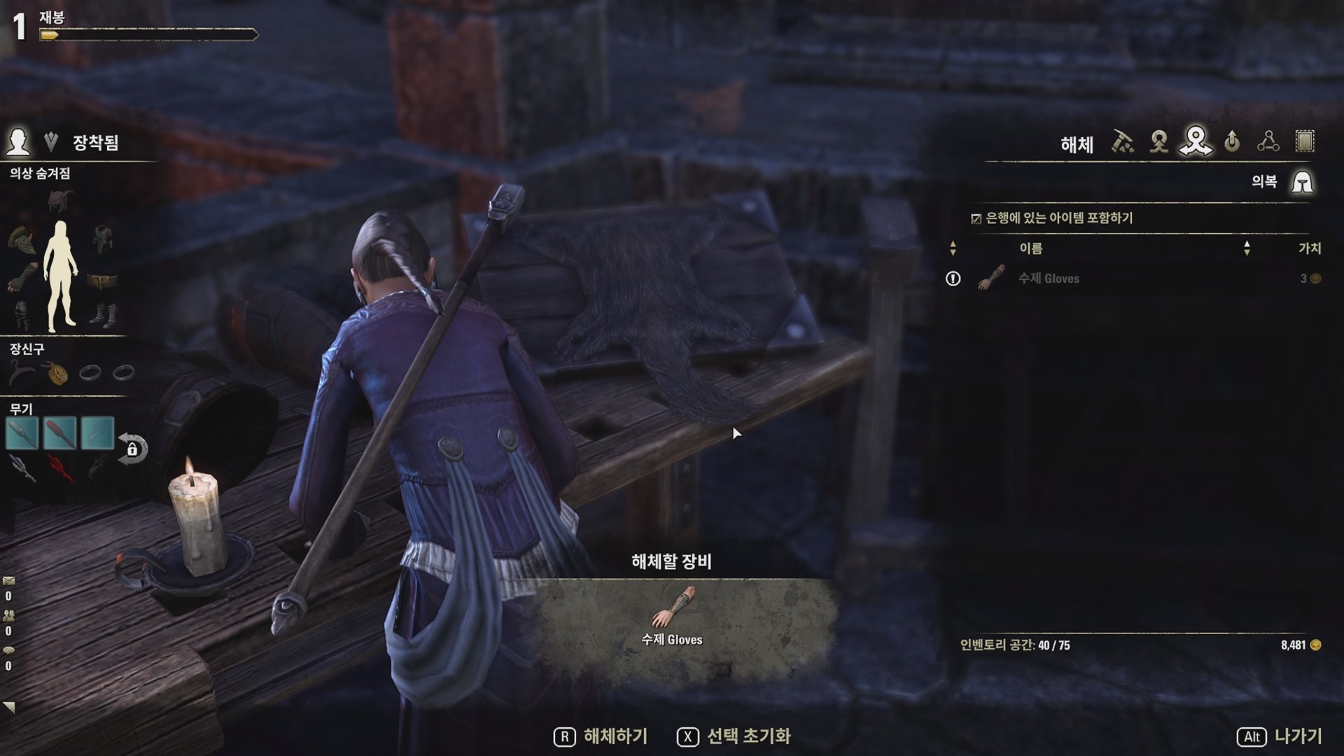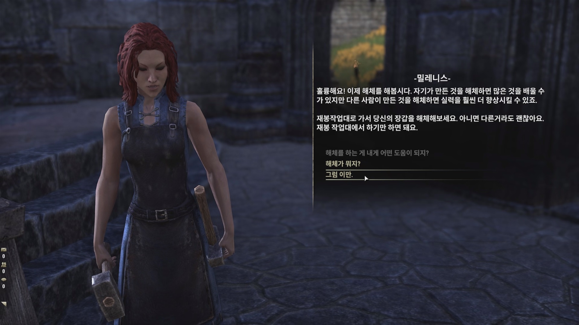 장갑을 만들고 밀레니스와 대화하면 방금 만든 장갑을 분해하라고 한다. 재봉 작업대로 가서 분해 탭에서 분해를 한다.