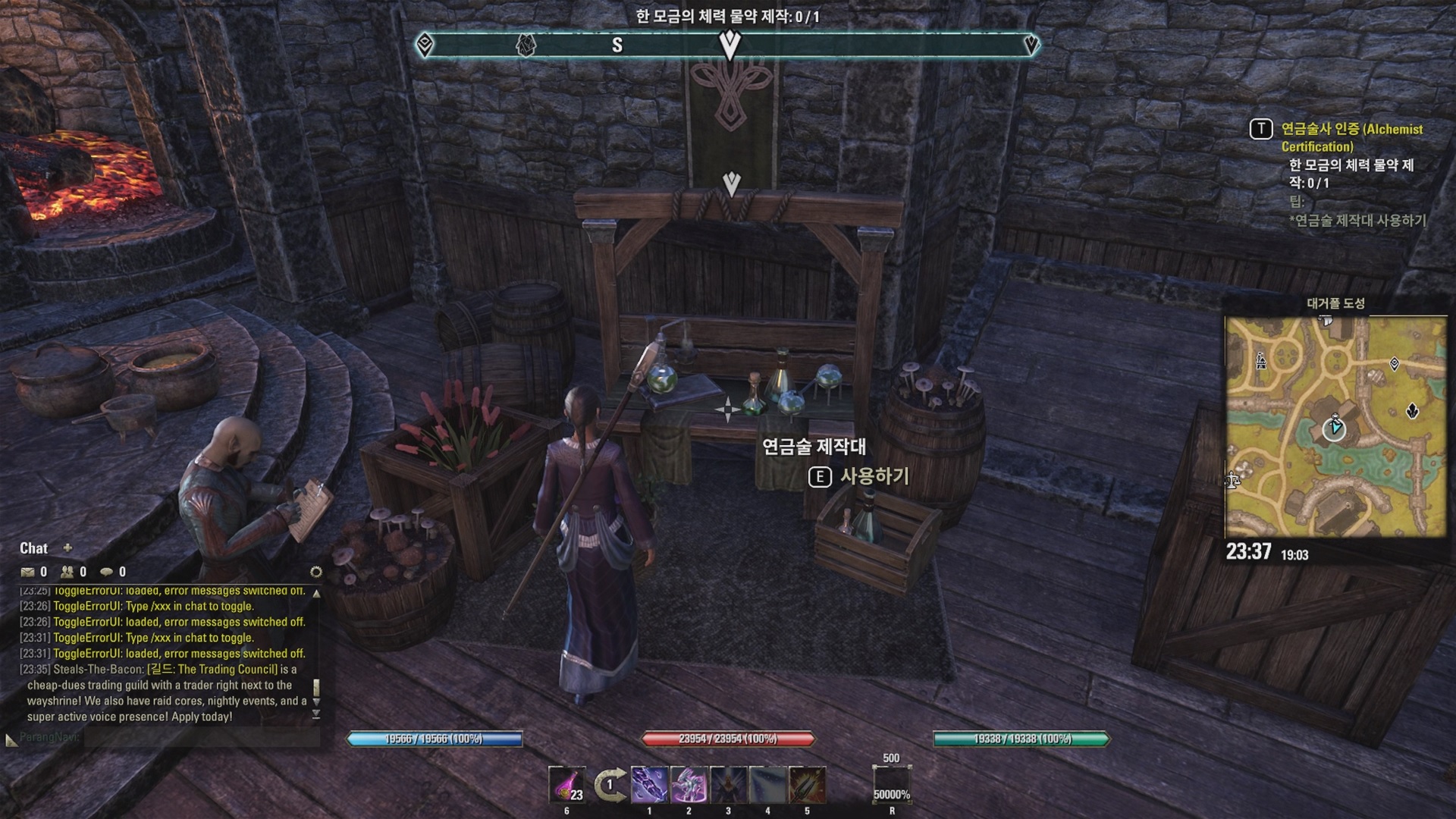 메이지 길드 내부에 있는 다넬 텔레노에게 말을 걸어 '연금술사 인증'에 대해 알려달라고 한다.