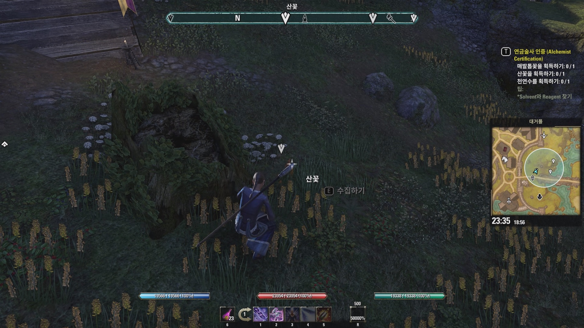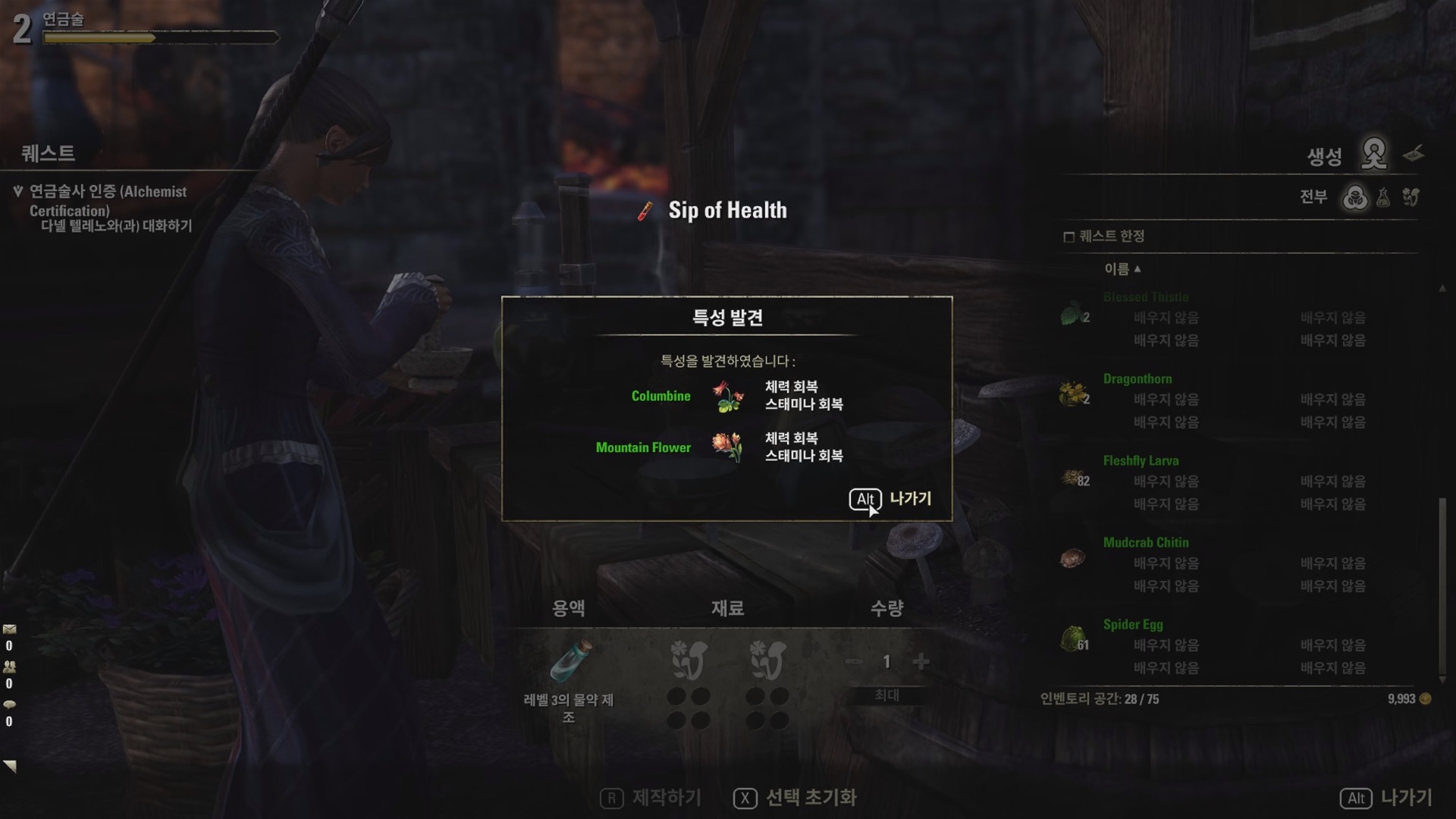 연금술 제작대로 가서 천연수(Natural Water), 매발톱 꽃(Columbine), 산 꽃(Mountain Flower)을 넣고 한모금의 체력 물약을 제작한다.