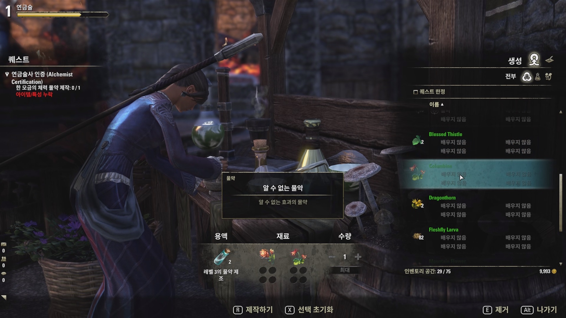 연금술의 경우 재료가 처음부터 속성이 나오지 않는다. 사용하거나(연금술 재료는 채집 후 바로 사용이 가능하다) 물약을 제조 함으로써 속성이 드러나는데, 아직 속성이 드러나 있지 않은 경우 퀘스트로 요구하는 물약을 만드는 재료가 있다해도 퀘스트 표시가 되질 않는다. 속성을 알면 표시가 된다. 그러니 부지런히 만들어서 재료 속성을 다 드러내야 나중에 일퀘 하기가 수월해진다.