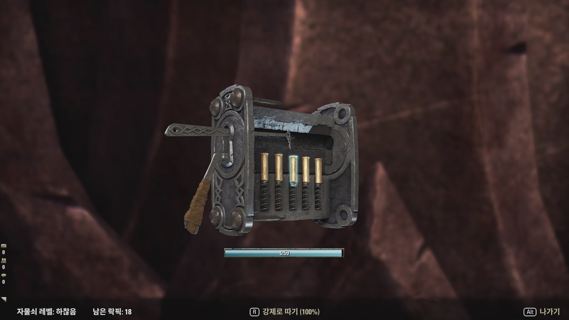 강을 따라 가면 잠긴 지하실 문이 나온다. 문을 따야 된다. 역시나 튜토리얼 미션 답네. 자물쇠 따는 방법은 락픽으로 꾹 눌러서 살짝 떨리기 시작할때 놓으면 걸리게 된다. 그렇게 5개를 모두 작업하자.