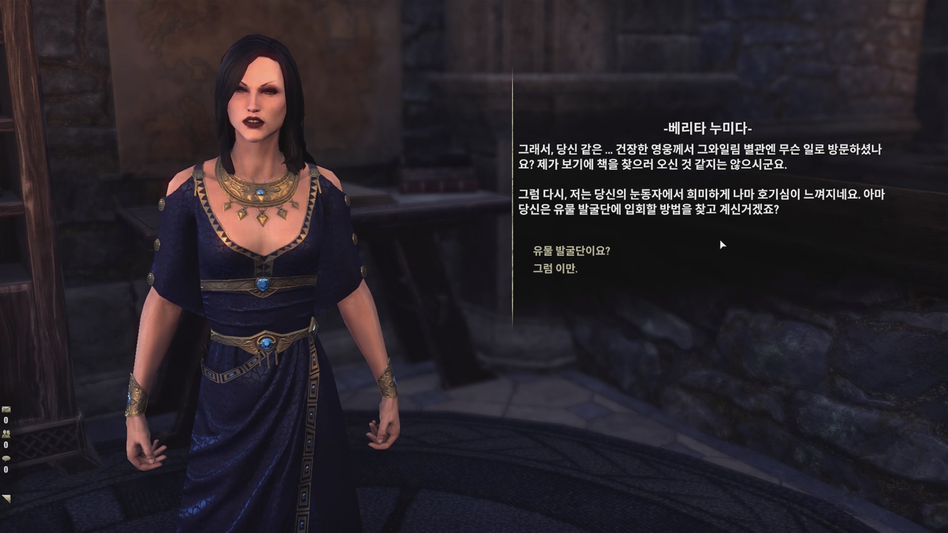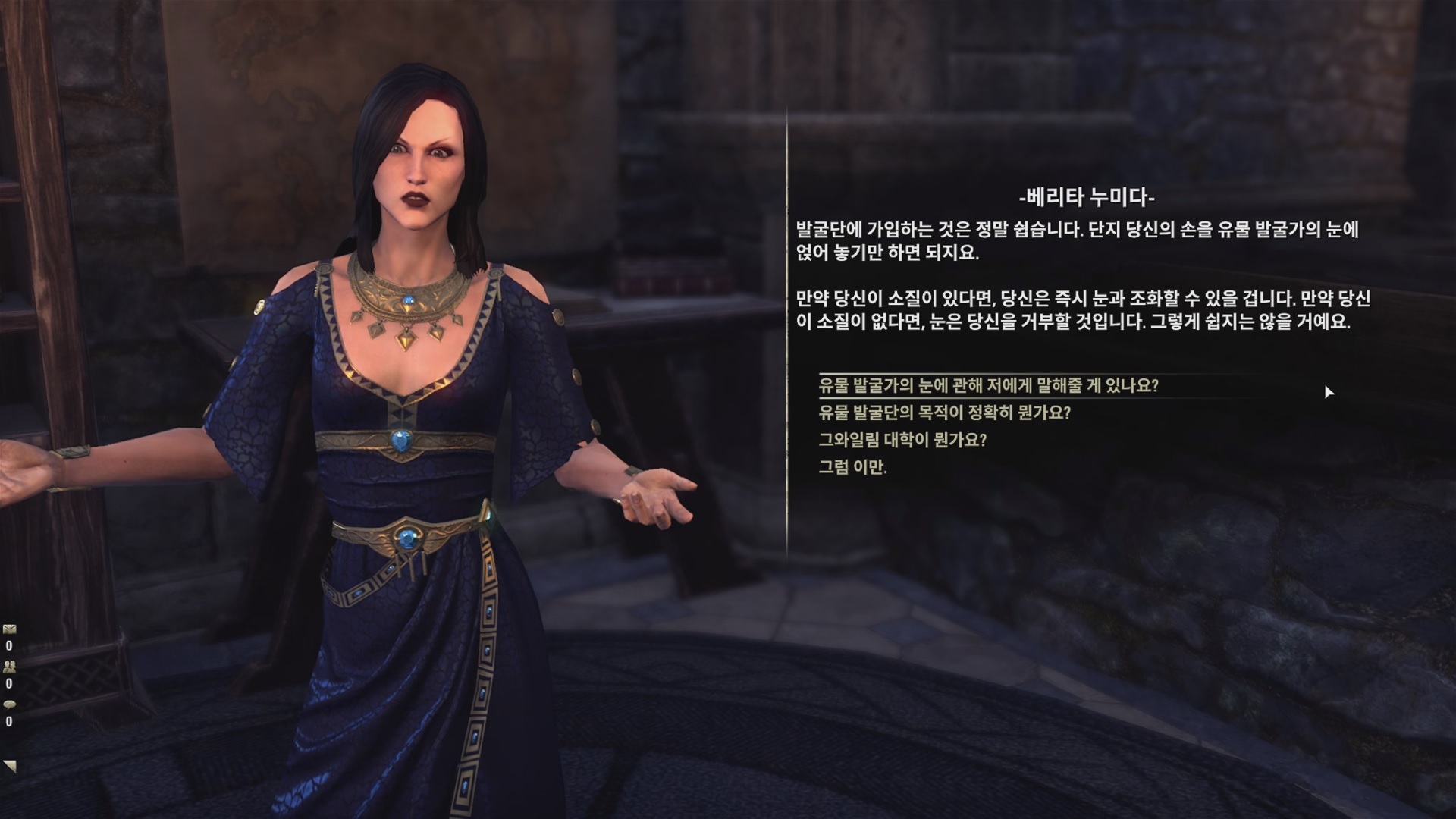 서부 스카이림 지역의 솔리튜드에 가면 유물 발군단이 있다. 그곳의 대표 베리타 누미다와 대화를 시작하면 유물 발굴을 위한 퀘스트가 시작된다.
