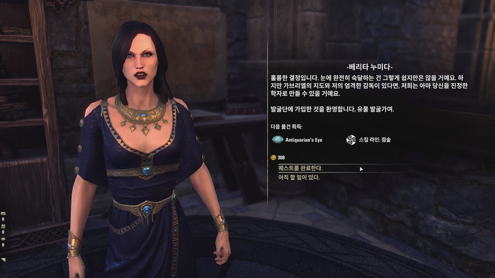 퀘스트는 일단 완료되고 발굴에 대한 스킬 라인을 획득하게 된다. 다음 퀘스트는 'The Antiquarian's Art (유물 발굴가의 예술)'로 발굴을 어떻게 하는지에 대한 방법을 알려주는 퀘스트다.