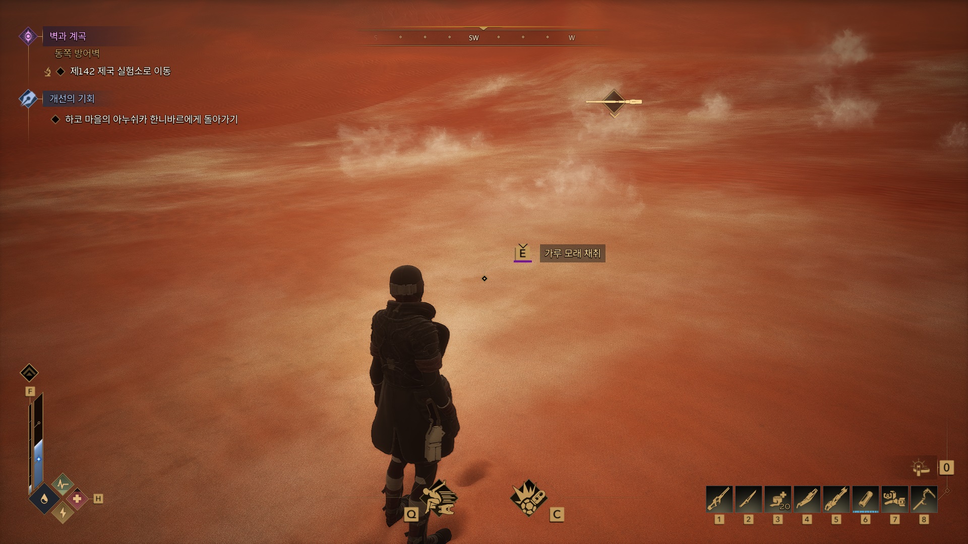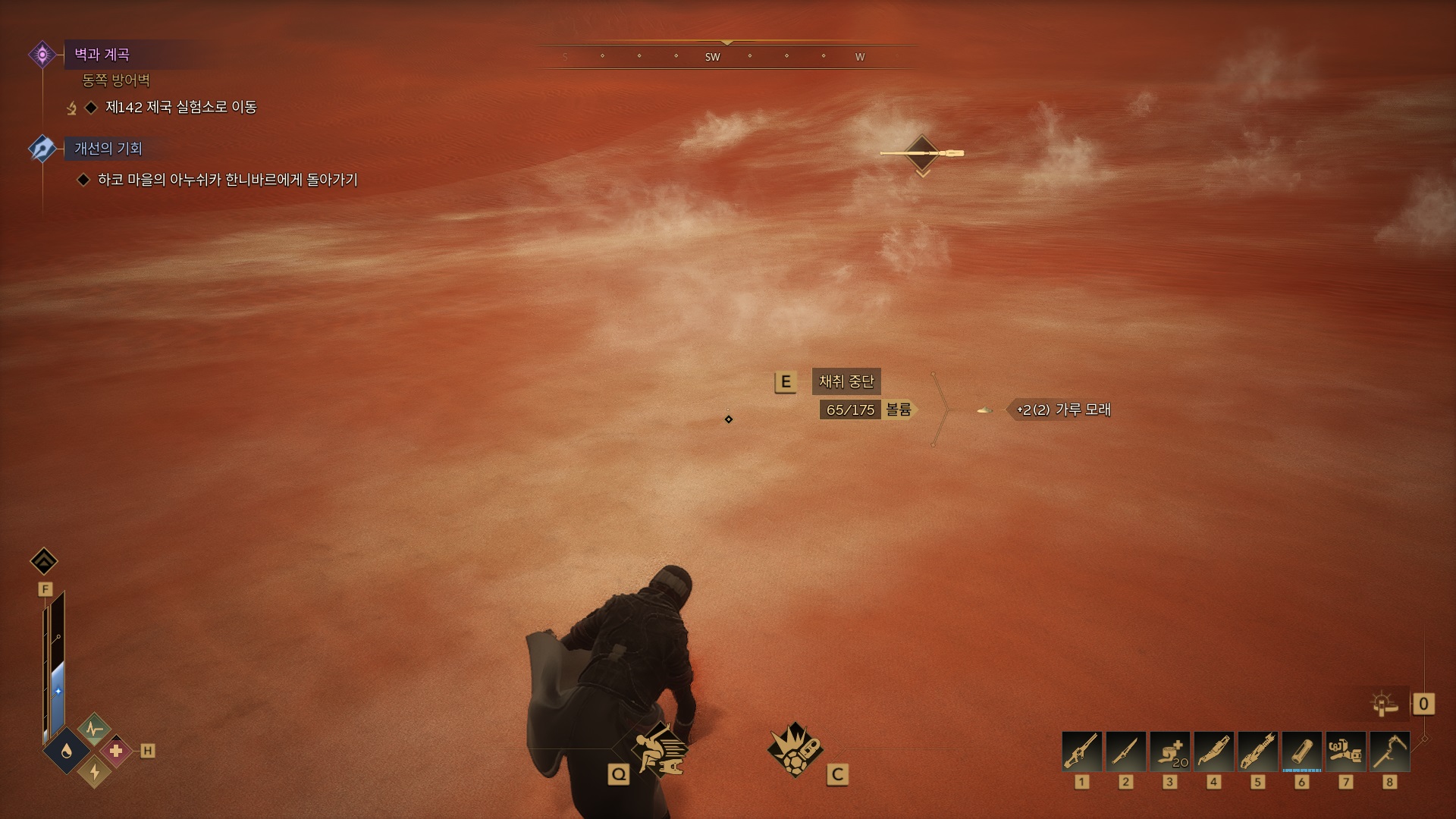 고정 압축기가 있다면 여기저기 쏴서 모인 모래를 줏으면 되고, 없다면 가까이 다가가서 E 키를 꾹 누르고 있으면 모래를 채취하기 시작한다.