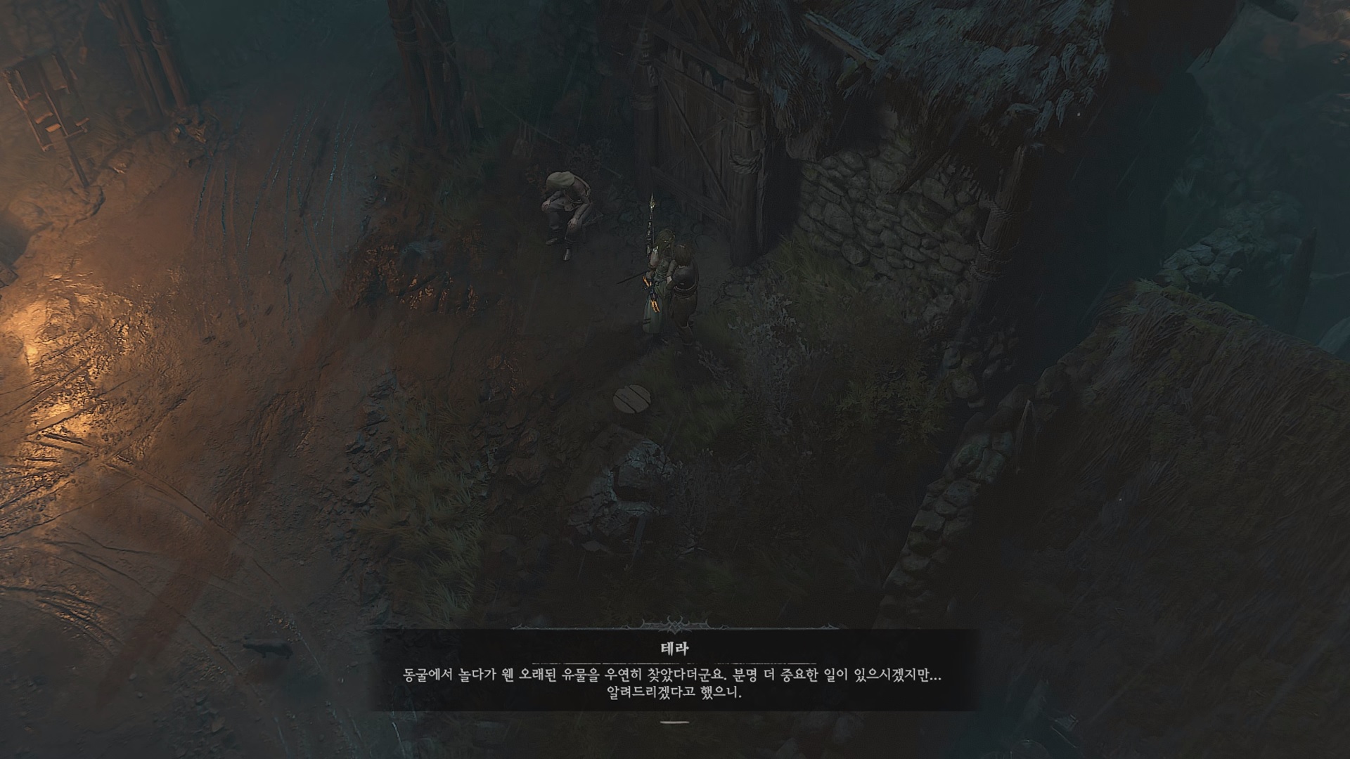 집 뒤쪽 테라에게 유물에 대해 물어보면 자기 아들이 동굴에서 놀다가 유물을 찾았다고 한다. 확인 하러 가보자.