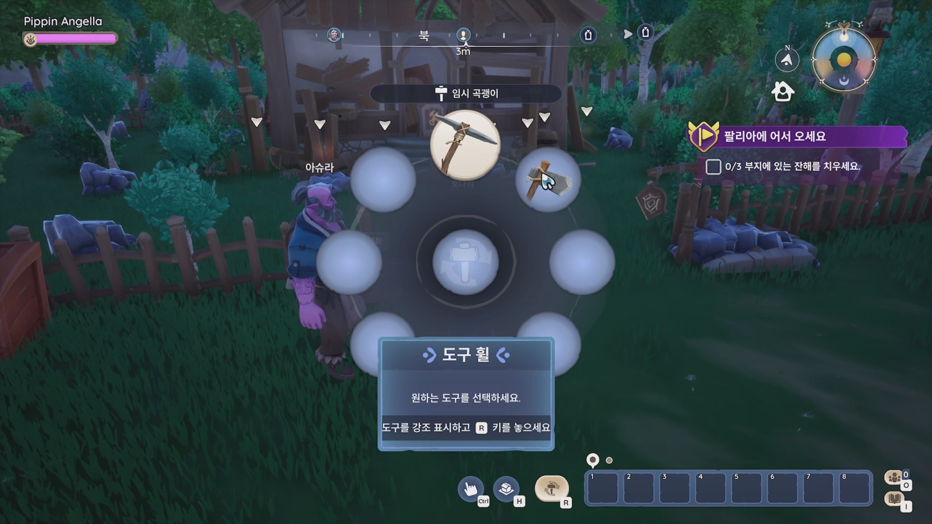 대화가 끝나면 도구 사용에 대해 알려준다. R 키를 누르고 있으면 도구 휠이 뜨고 원하는 도구에 마우스를 가져대고 R키를 놓으면 된다.