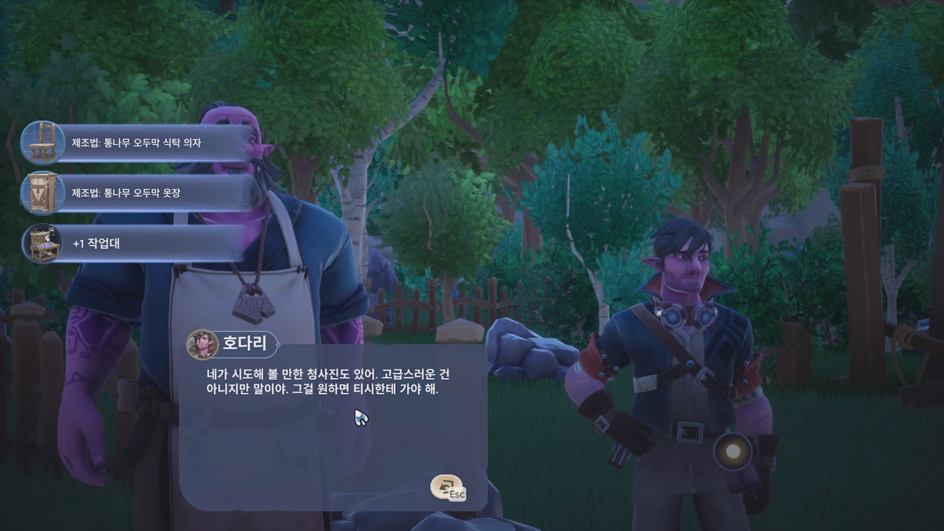 집을 수리하하고 아슈라, 호다리와 대화하면 작업대와 가구를 준다.