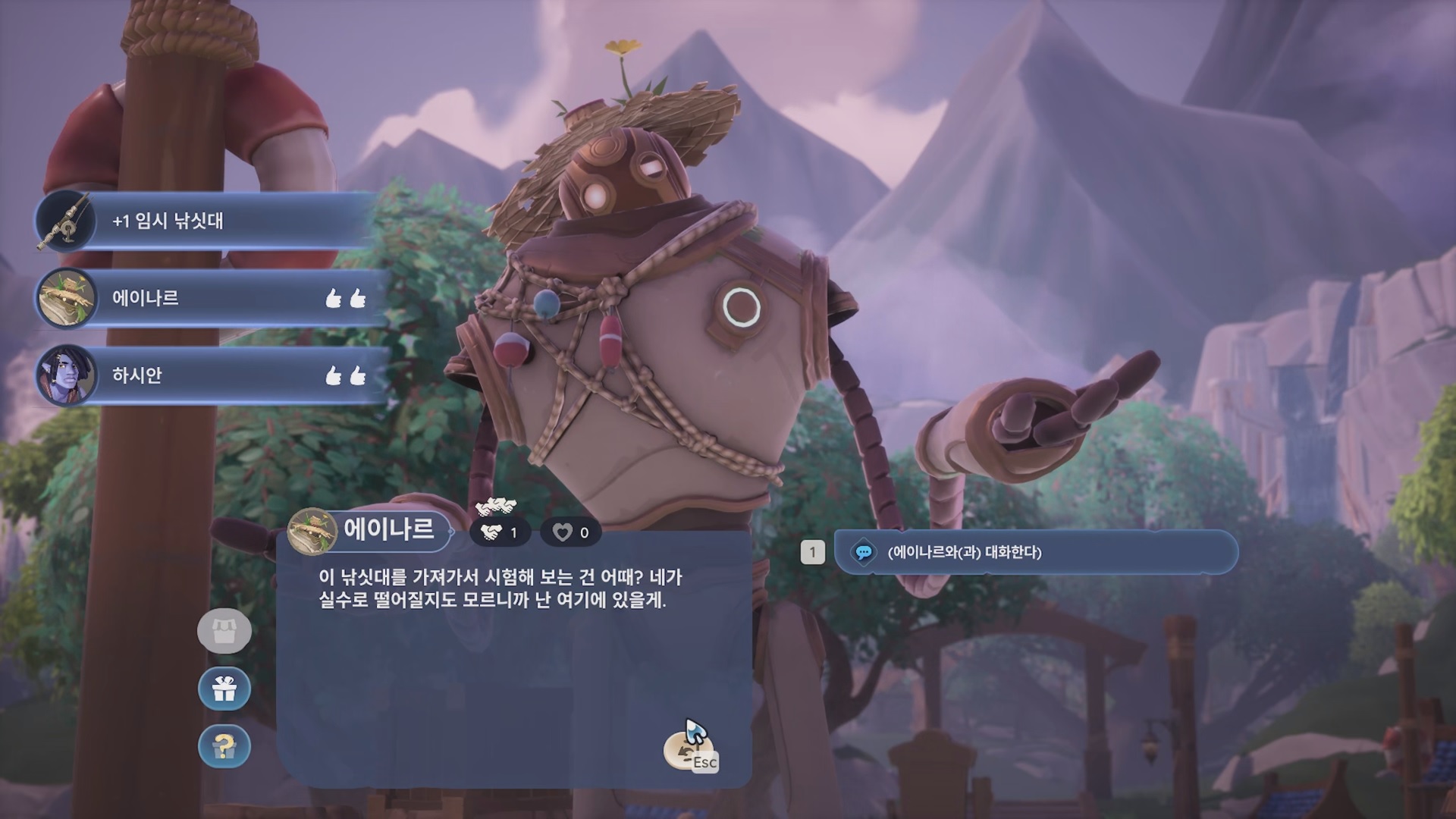 에이나르와 대화하면 임시 낚싯대를 주고 가이드 퀘스트 '낚시의 기초'를 받을 수 있다. 낚싯대를 장착하게 되면 낚시 하는 방법을 알려준다.