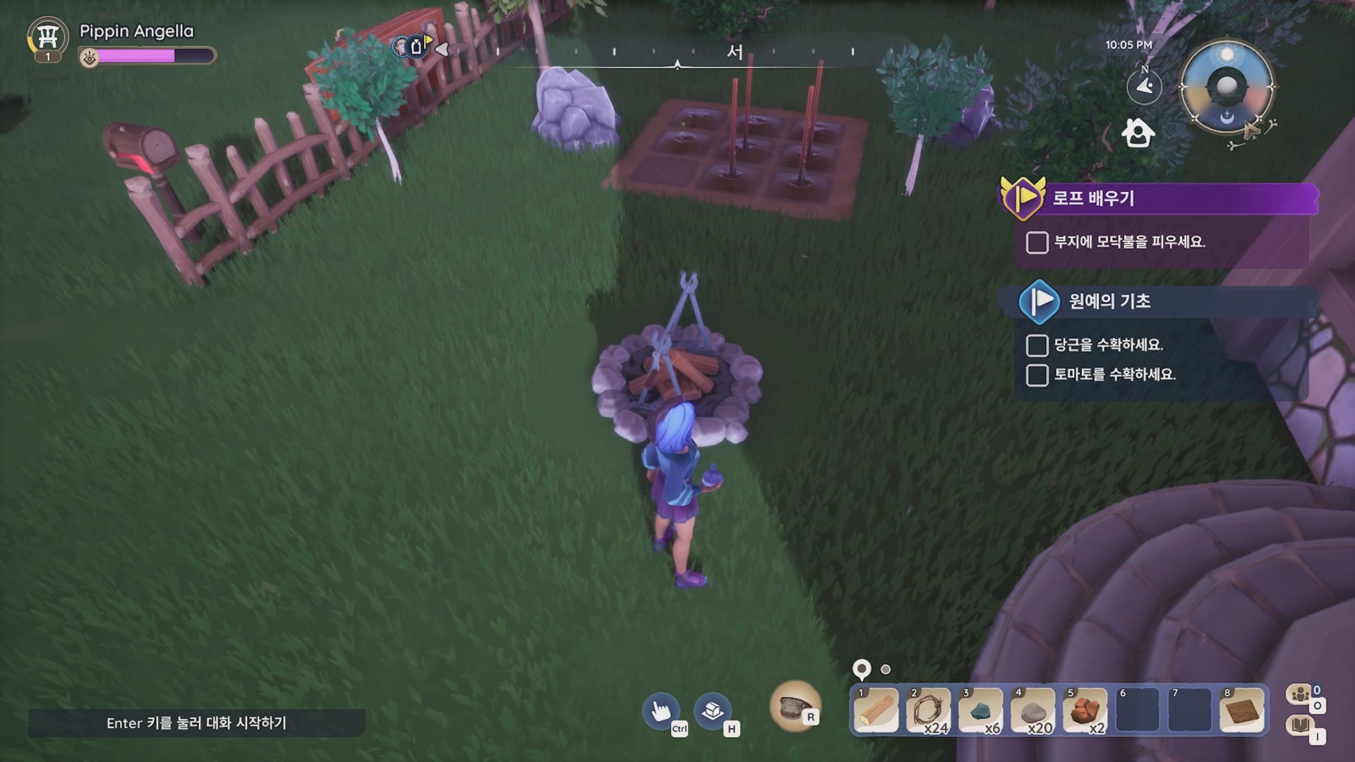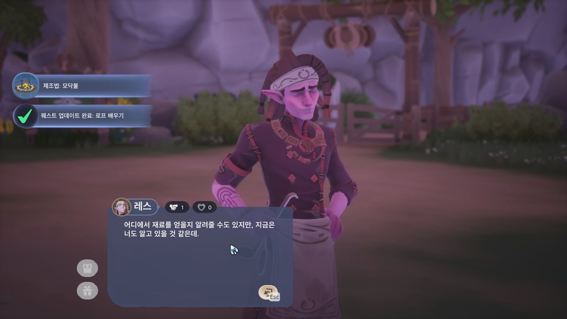 이어서 레스가 부지에 있는데 대화하면 '모닥불' 제조법을 알려준다. 작업대에서 만들면 된다.