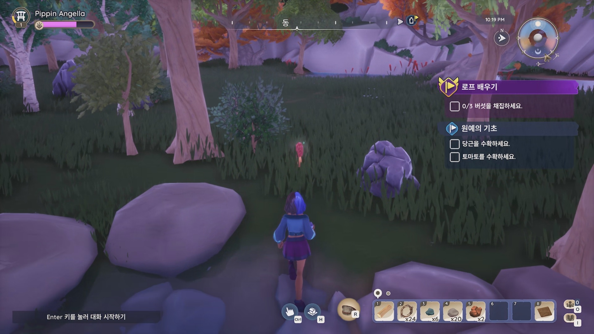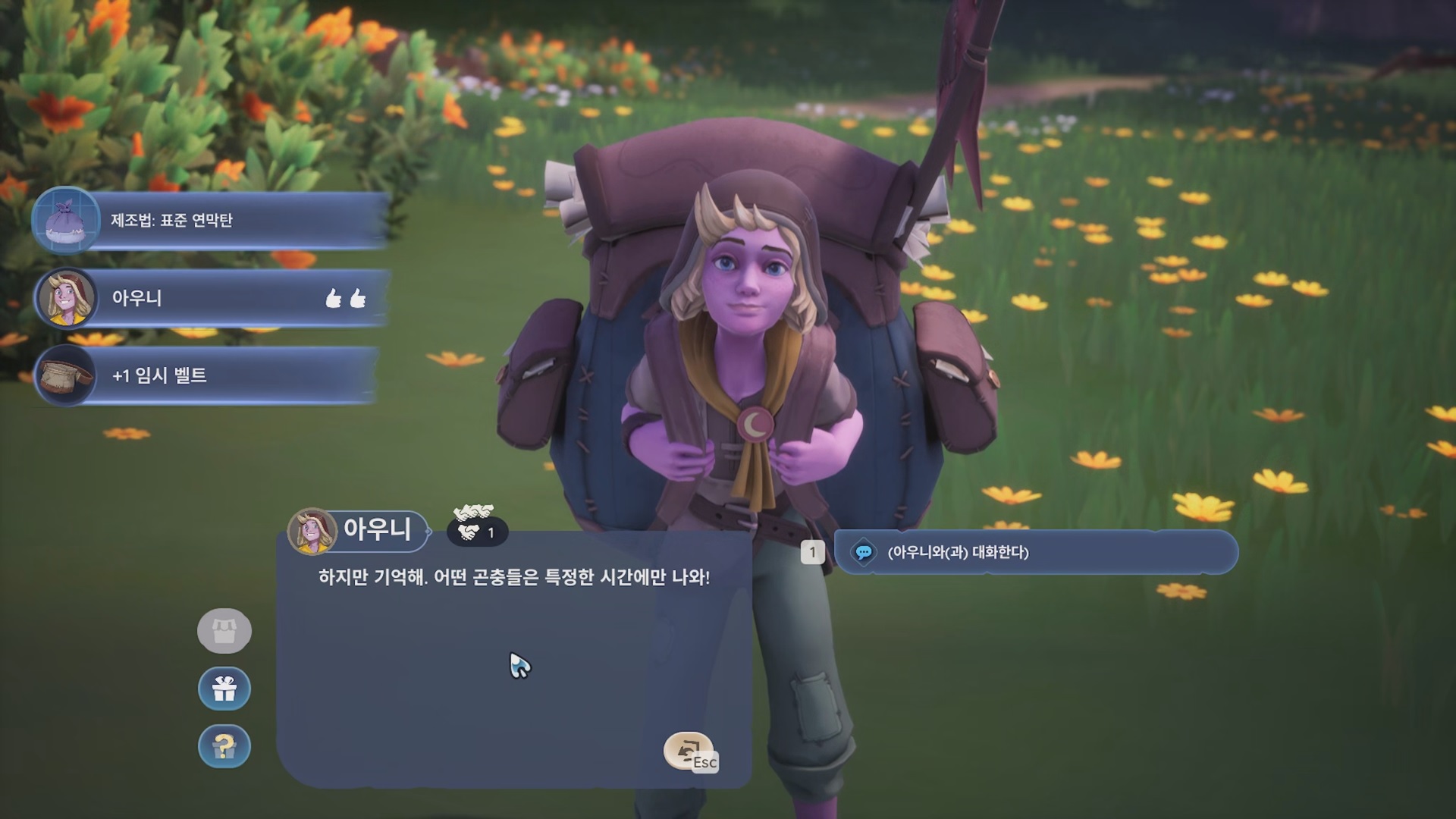아우니와 대화해서 하면 임시 벨트, 표준 연막탄을 주고 '곤충 채집의 기초' 가이드 퀘스트를 준다.
