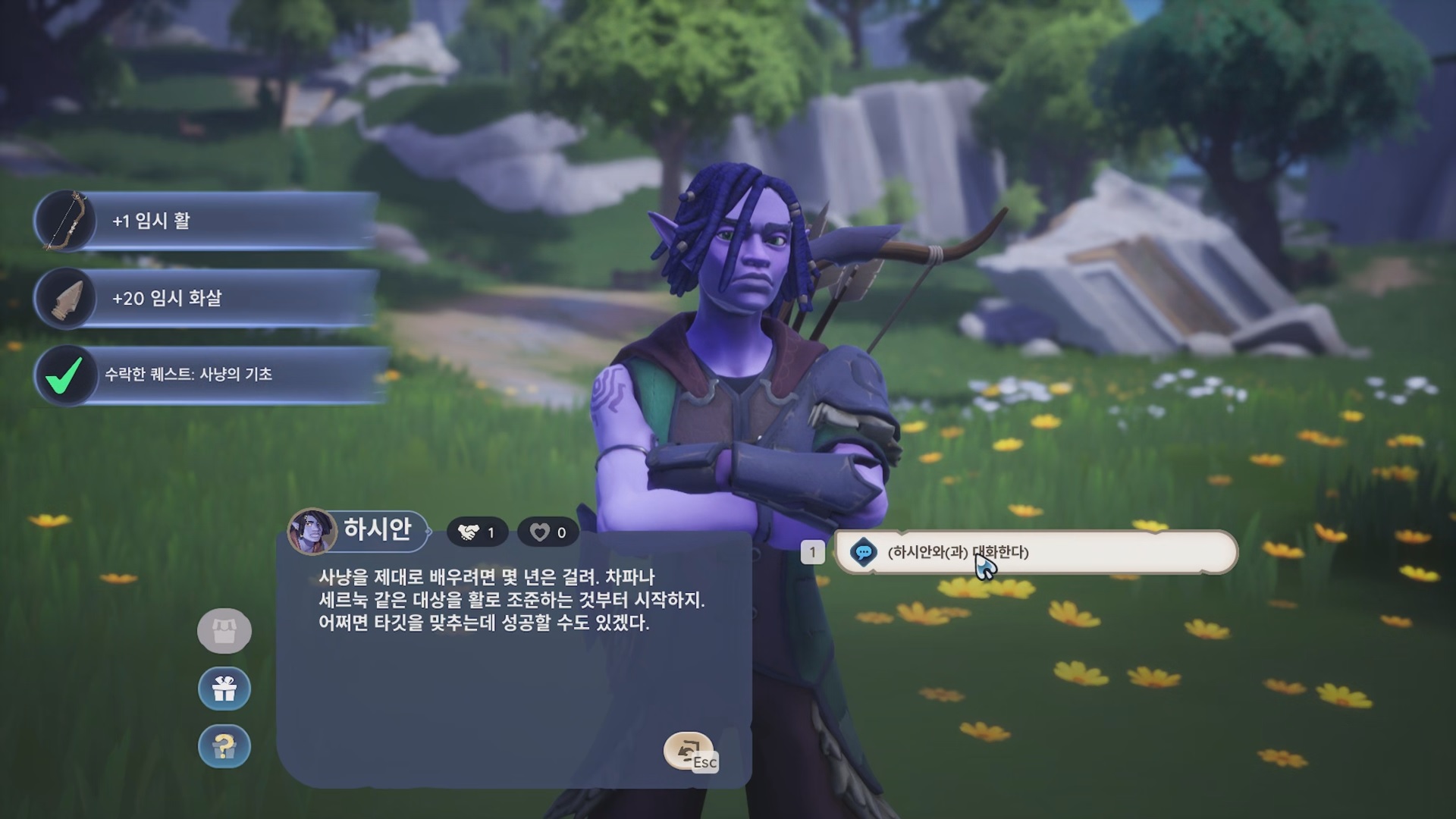 하시안에게 가서 사냥 하는 방법을 알려달라고 하면 '사냥의 기초' 가이드 퀘스트가 뜨고 임시 활, 임시 화살을 준다.