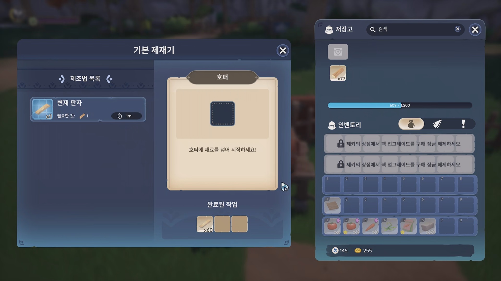 기본 제재기에서 변재 판자를 만들자. 변재 1개당 변재 판자 1개다. 1개 제작에 1분이 걸리니 60분이 걸린다!