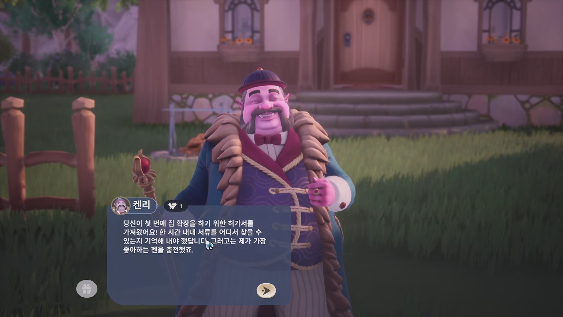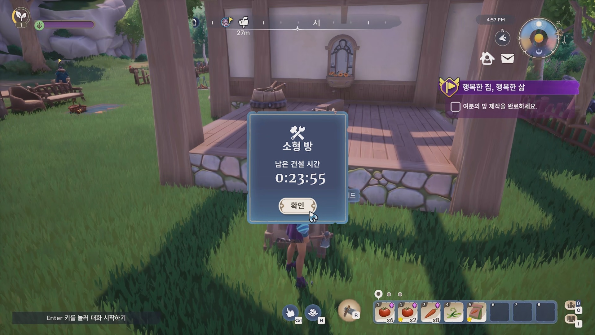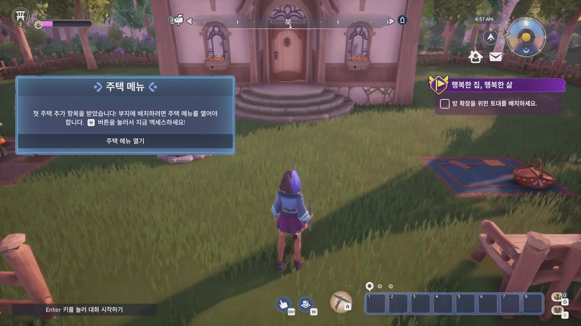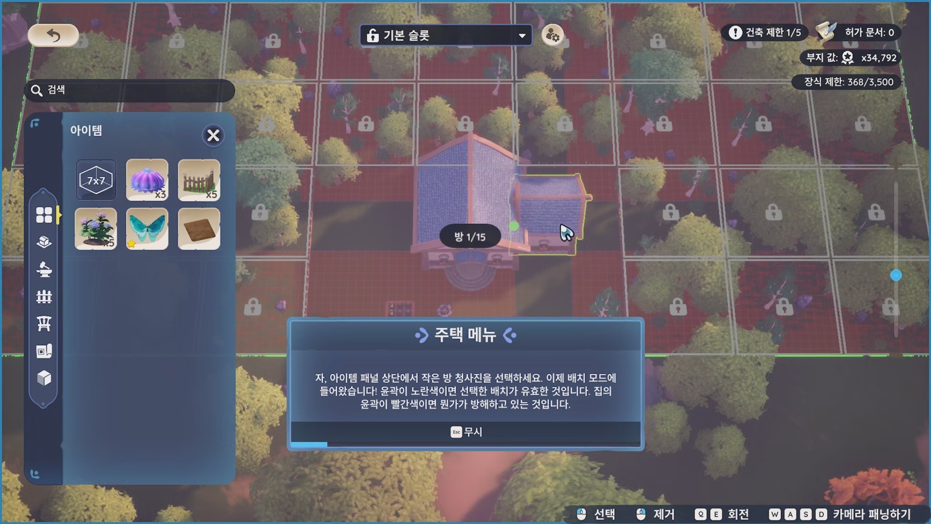 대화를 끝내고 H 키를 누르면 주택 메뉴가 열린다. 7x7 소형 방을 선택하고 부지 내에 원하는 곳에 배치하자.