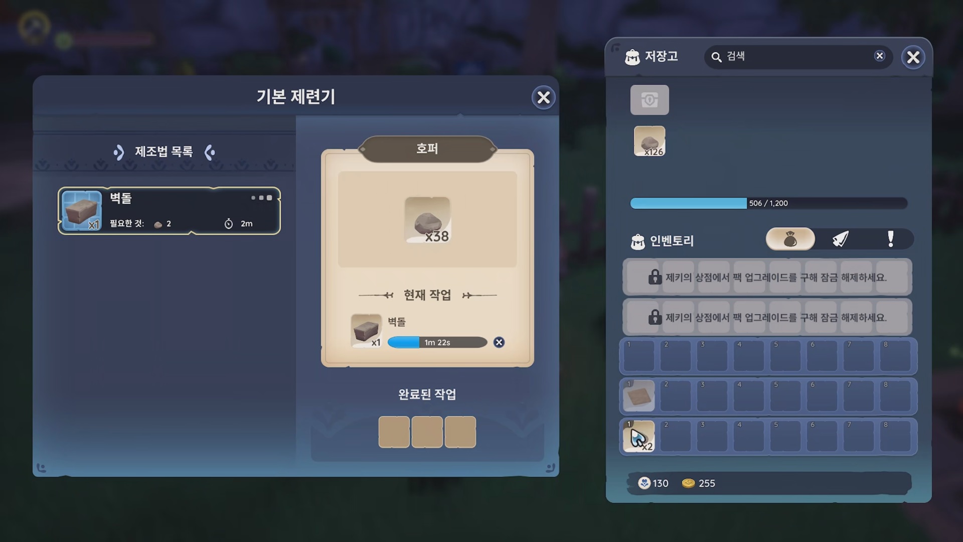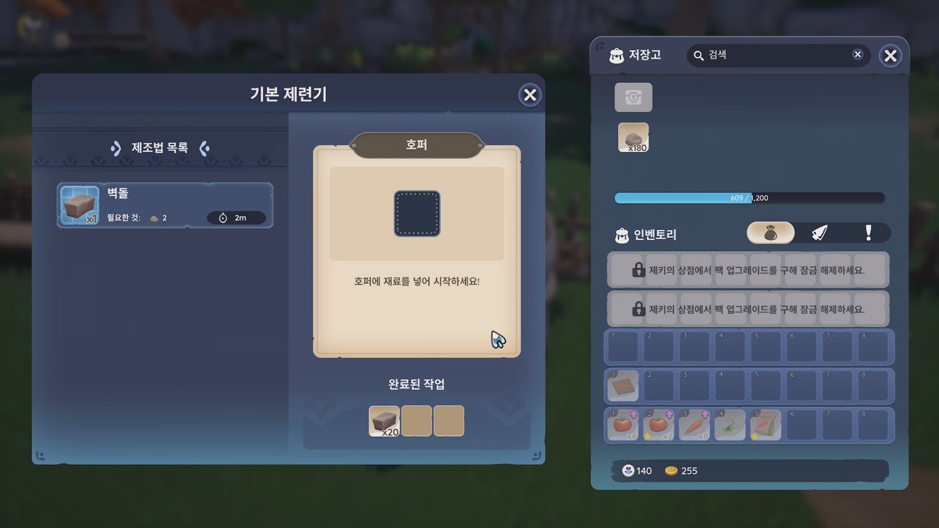 기본 제련기에서 벽돌을 만들자. 돌 2개당 벽돌 1개다. 1개 만드는데 2분이니 40분이 걸린다.