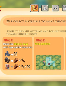 Windy Kingdom17 Windy Kingdom 윈디 킹덤 - 도구 아이템 농사 및 자원 수집에 필요한 도구들이다.아이템을 사용하는데는 따로 레벨이 필요없지만 제작하는데는 캐릭터의 레벨이 요구된다.도구는 사용시 에너지를 소모한다. 잘못된 대상에게 사용하거나 그냥 휘두르는건 에너지 소모가 없다. 도끼(Axe)는 나무를 벌목해서 자원을 채취하는 도구다. 등급이 올라갈수록 보다 빠른 벌목이 가능하다. Rock Axe 작은 나무들을 벌목할 수 있다. 한손 사용. 제작 가능 레벨 : 1제작 재료 : Bough(5), Rock(5)내구도 : 50에너지 소모 : 1판매 가격 : Metal Axe 중간 크기 나무까지 벌목 가능. 한손 사용. 제작 가능 레벨 : 3제작 재료 : Bough(5), Metal(4)내구도 : 100에너지 소모 : 1.5판매 가격 : Silver Axe 큰 나무도 벌.. 2020. 8. 31. Windy Kingdom 윈디 킹덤 - 미니 퀘스트 해당 레벨에 따라서 미니퀘스트라고 따로 열리는데, 퀘스트 완료시 골드를 지급한다.3레벨 이후부터 현재 레벨 +1까지 순차적으로 열리는데 뭔가를 만드는 퀘스트다. CRAFT A STRAW HAT 요구 사항 : 레벨 3필요 재료 : Fibers(10), Leaf(10)보상 : 50G CRAFT A METAL SWORD 요구 사항 : 레벨 4필요 재료 : Metal(5)보상 : 50G CRAFT A LEAF ARMOR 요구 사항 : 레벨 5필요 재료 : Bark(3), Fibers(10), Leaf(15)보상 : 80G CRAFT A WOOD RING 요구 사항 : 레벨 6필요 재료 : Bark(3), Fibers(5), Bough(5) 보상 80G CRAFT A WOODEN SHIELD 요구 사항 : 레벨 .. 2020. 8. 31. Windy Kingdom 윈디 킹덤 메인 퀘스트 - 왕국의 상황과 농장에 대해서 드디어 왕국에 입성! 통치자이자 여왕인 베린다(Belinda)와 대담인데... 이름이 마리엘로 표시된다..언젠간 수정되겠지. 하여튼 대화만 하면 되는 퀘스트다. "반가워요. 내 이름은 베린다. 이 왕국의 통치자죠." "매직 스톤을 다시 찾아와줘서 고맙군요. 이 스톤은 왕국의 영혼과 같은 존재죠." "미래에서 왔다고 했죠? 다들 그렇게 말하더군요." "병 때문에 당신을 좀 더 일찍 못 만난게 아쉬웠어요." "우리 왕국은 끔직한 비극 이후 생존하기 위해 많은 어려움을 겪었죠." "왕국의 마지막 남은 남자가 세상을 떠나자 몬스터들의 공격이 시작됐어요." "우리는 오늘날까지 몬스터들에게 대항해 용감하게 싸워왔었죠." "마이의 가족이 살던 농장, 그러니깐 지금 당신이 살고 있는 그 집이 특히 몬스터들의 공격이 심.. 2020. 8. 21. Windy Kingdom 윈디 킹덤 메인 퀘스트 - 여왕을 치료 하라 유리카가 엘리를 만나보라고 해서 Hospital Shop, 즉 병원으로 보면 될 것 같다. 하여튼 병원에 도착했다. 들어가자. 오래간만에 본다는 엘리. 나의 활약상을 이미 전해 들은 모양이다. 아.. 그러고보니 날 처음 발견하고 구해준 사람이구나. 엘리는 이 왕국의 의사이다. 여왕 베린다(Belinda)가 지금 아파서 만나질 못 한다고 한다. 이른바 멘탈붕괴로 아무도 안 만나고 방콕한다는 것.. (응?) 그렇게 된건 매직 스톤(Magic Stone)을 몬스터가 가져갔기 때문이라는데... 내과의사라서 정신과적이면서 마법적인건 치료를 못 하는 모양이다. 성 앞을 지키고 있는 일레인(Elain)을 만나보라고 한다. 성앞에 있는 일레인을 만나보자. 성을 지키고 있단다. 왕실 근위대 정도 되겠군. 뭐라뭐라 말이 .. 2020. 8. 20. Windy Kingdom 윈디 킹덤 메인 퀘스트 - 닭을 키워 달걀 얻기 역시.. 내가 구한 것은 병아리였어.. 어찌됐던, 이 병아리를 닭으로 키워야 되고, 달걀을 수확해야 된다. 일단 닭장이 있는 곳으로 가자. 닭장에가서 E 키를 누르면 이렇게 나오는데, 1레벨 닭장에는 병아리 3마리를 넣을 수 있다. 딱 3마리네.. 집어 넣자. 병아리들이 3마리 필드를 돌아다니기 시작한다. 헌데.. 먹이가 없다. 밀(Wheat)이 필요하다!! 일단 Seed Shop으로가서 밀 씨앗을 구매한다. 헥.. 40골드.. 왜 이렇게 비싸.. 27개를 샀다. 재배하는데 6일이나 걸린다는데.. 병아리들 굶어 죽는건 아닌가 몰라.. 27칸의 밭을 만들었고 밀을 심었다. 매일매일 자랄때마다 물을 줘야 한다. 아.. 비오는 날은 물 안줘도 되서 편하긴 하더라. 병아리들 정보를 보면.. 이름(나폴레옹!!),.. 2020. 8. 20. Windy Kingdom 윈디 킹덤 메인 퀘스트 - 닭장을 만들자 유리코는 구해준 닭들을 키울 수 있게 방법을 알려준다면서, 닭장(Chicken Coop)을 만들라고 한다. 퀘스트 로그에 보면 Step 1이 잘못 된건데, 못을 단조 기계(Forging Machine)으로 만들라고 나와있지만 2번째 대패 기계(Planing Machine) 에서 만들수 있다. 단조 기계는 만들 필요가 없다는 것! 우선 닭장 재료를 알아보자. 닭은 원래 레벨 30이 되어야 만들 수 있지만 퀘스트 때문에 이렇게 열려 있다. 재료가 목재(Square Wood) 10개, 못(Nail) 10개, 나무막대(Wooden Sticks) 5개이다. 이 재료들은 모두 대패 기계에서 만들 수 있다. 그러니 대패 기계를 만들 수 있는 재료를 알아 보자. 나무 50개, 나뭇가지 30개, 구리바 1개(구리 10개.. 2020. 8. 20. Windy Kingdom 윈디 킹덤 - 인터페이스 설명 상단 정보창 게임 화면 상단에 표시된다. 왼쪽편 하트모양은 Health(체력)을 0이 되면 사망하고 가장 최근에 세이브된 상태를 강제로 로딩하게 된다. 24:00가 되기전에 잠을 자지 못할 경우 역시 사망. Health + 아이템으로 회복한다. 번개 모양 아이콘은 에너지인데 회복 아이템은 에너지라고 표시 되지만 무기나 도구의 경우 사용할때 스테미너가 닳는다고 표시되어 있어